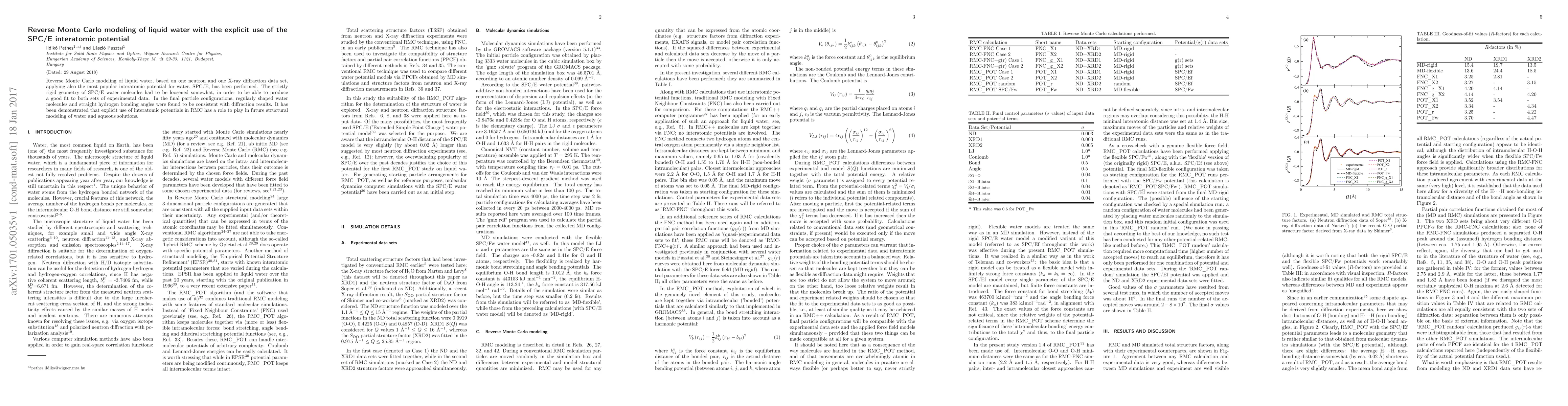 Reverse Monte Carlo modeling of liquid water, based on one neutron and one X-ray diffraction data set, applying also the most popular interatomic potential for water, SPC/E, has been performed. The strictly rigid geometry of SPC/E water molecules had to be loosened somewhat, in order to be able to produce a good fit to both sets of experimental data. In the final particle configurations, regularly shaped water molecules and straight hydrogen bonding angles were found to be consistent with diffraction results. It has been demonstrated that explicit use of interatomic potentials in RMC has a role to play in future structural modeling of water and aqueous solutions.