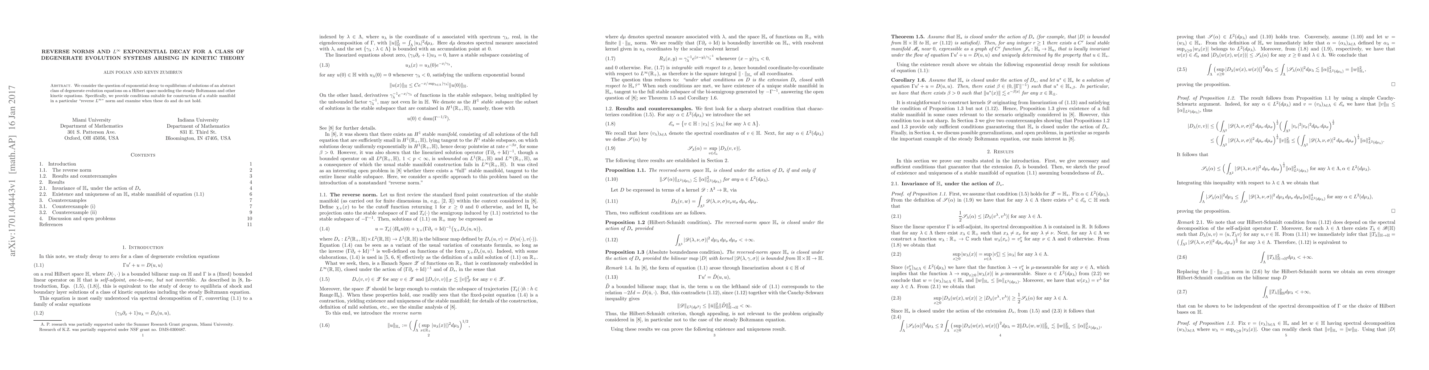 We consider the question of exponential decay to equilibrium of solutions of an abstract class of degenerate evolution equations on a Hilbert space modeling the steady Boltzmann and other kinetic equations. Specifically, we provide conditions suitable for construction of a stable manifold in a particular "reverse L infinity norm" and examine when these do and do not hold.