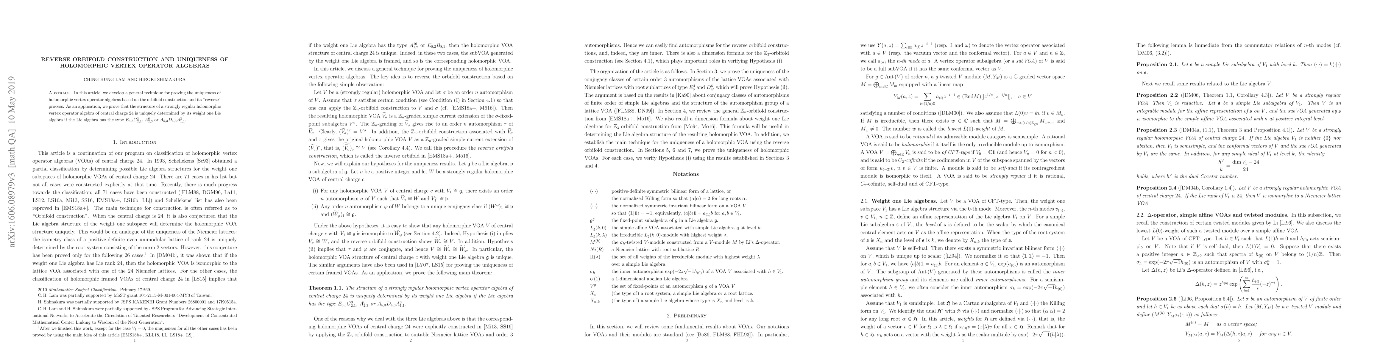 Summary: This paper introduces a novel method using reverse orbifold construction to demonstrate the uniqueness of holomorphic vertex operator algebras. It specifically proves the unique structure of strongly regular holomorphic vertex operator algebras of central charge 24, given certain conditions on their weight one Lie algebras.