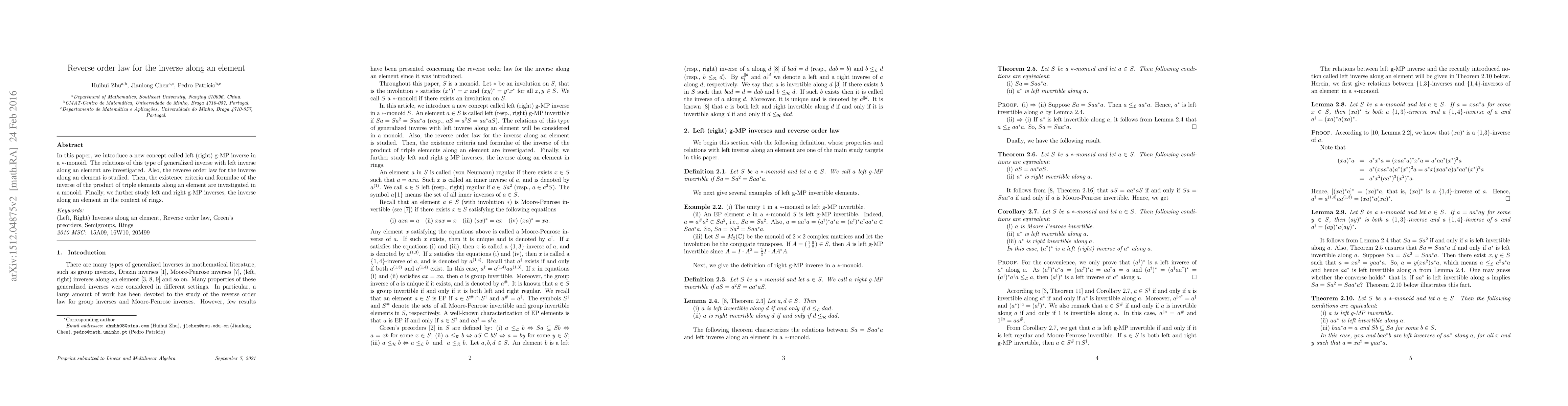 In this paper, we introduce a new concept called left (right) g-MP inverse in a $*$-monoid. The relations of this type of generalized inverse with left inverse along an element are investigated. Also, the reverse order law for the inverse along an element is studied. Then, the existence criteria and formulae of the inverse of the product of triple elements along an element are investigated in a monoid. Finally, we further study left and right g-MP inverses, the inverse along an element in the context of rings.
