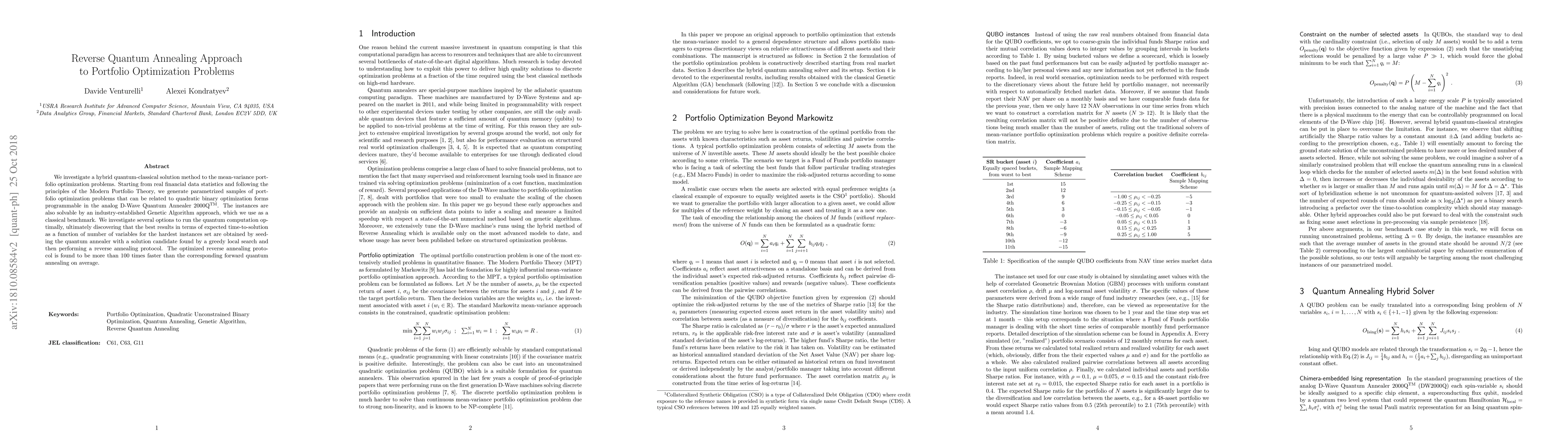 We investigate a hybrid quantum-classical solution method to the mean-variance portfolio optimization problems. Starting from real financial data statistics and following the principles of the Modern Portfolio Theory, we generate parametrized samples of portfolio optimization problems that can be related to quadratic binary optimization forms programmable in the analog D-Wave Quantum Annealer 2000Q. The instances are also solvable by an industry-established Genetic Algorithm approach, which we use as a classical benchmark. We investigate several options to run the quantum computation optimally, ultimately discovering that the best results in terms of expected time-to-solution as a function of number of variables for the hardest instances set are obtained by seeding the quantum annealer with a solution candidate found by a greedy local search and then performing a reverse annealing protocol. The optimized reverse annealing protocol is found to be more than 100 times faster than the corresponding forward quantum annealing on average.