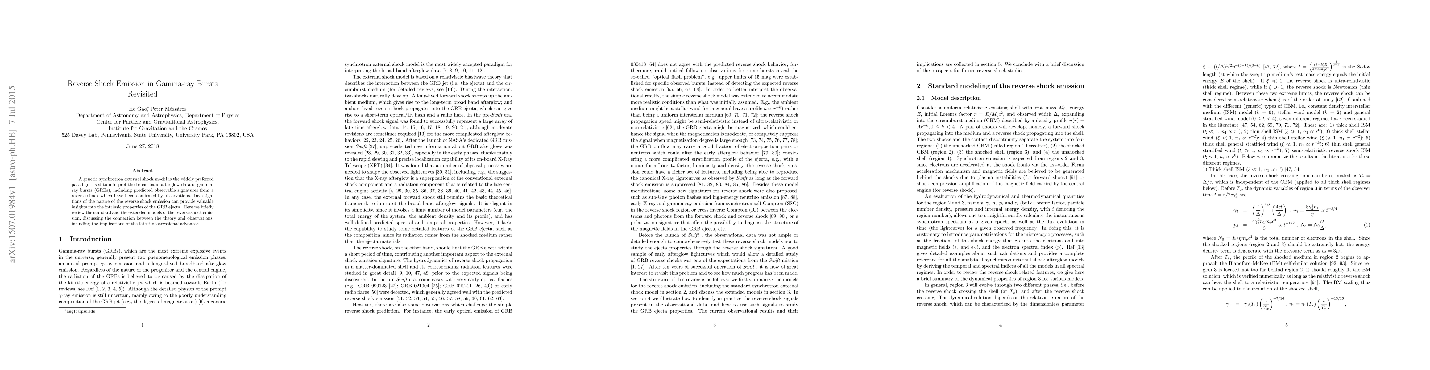 This paper reviews standard and extended models of reverse shock emission in gamma-ray bursts, emphasizing their theoretical underpinnings and observational validations, and discusses how recent advances in observations inform our understanding of GRB ejecta properties.
