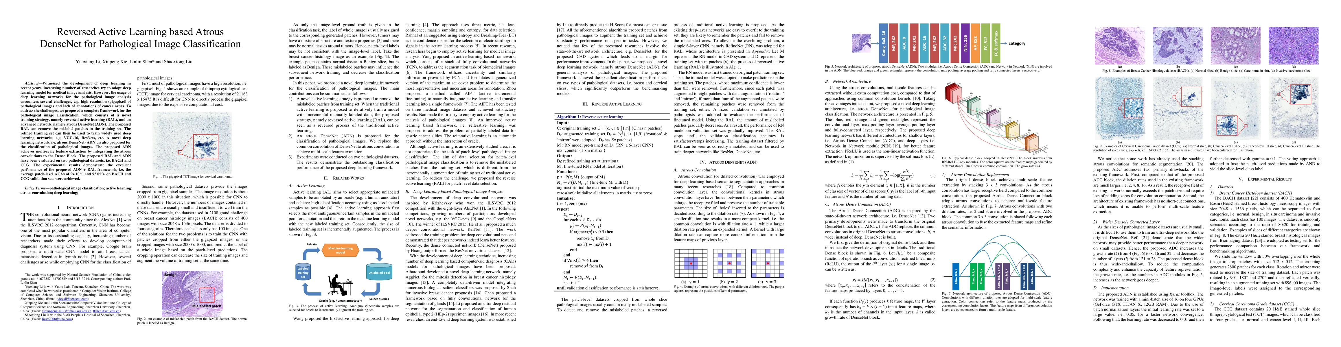 This paper proposes a framework combining reversed active learning (RAL) and an atrous DenseNet (ADN) for pathological image classification, addressing challenges like high resolution and lack of annotations. The ADN network achieves multi-scale feature extraction, and the RAL strategy improves training data quality, achieving high accuracy on BACH and CCG datasets.