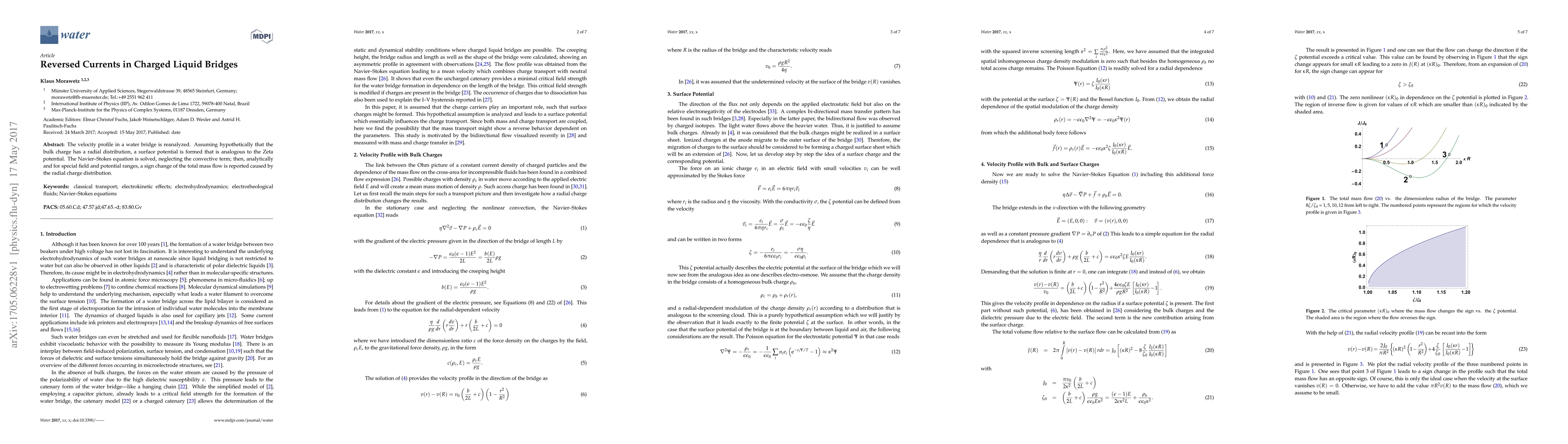 The velocity profile in a water bridge is reanalyzed. Assuming hypothetically that the bulk charge has a radial distribution, a surface potential is formed that is analogous to the Zeta potential. The Navier Stokes equation is solved, neglecting the convective term; then, analytically and for special field and potential ranges, a sign change of the total mass flow is reported caused by the radial charge distribution.