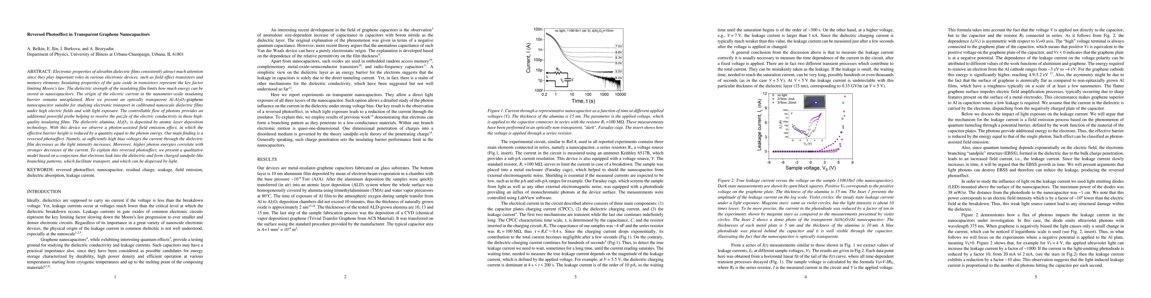 This paper explores the electronic properties of ultrathin dielectric films in transparent graphene nanocapacitors, revealing a reversed photoeffect where increased light intensity decreases current flow under high bias voltages. The study proposes a model suggesting that electrons form charged patterns within the dielectric that can be dispersed by light, explaining the observed phenomenon.
