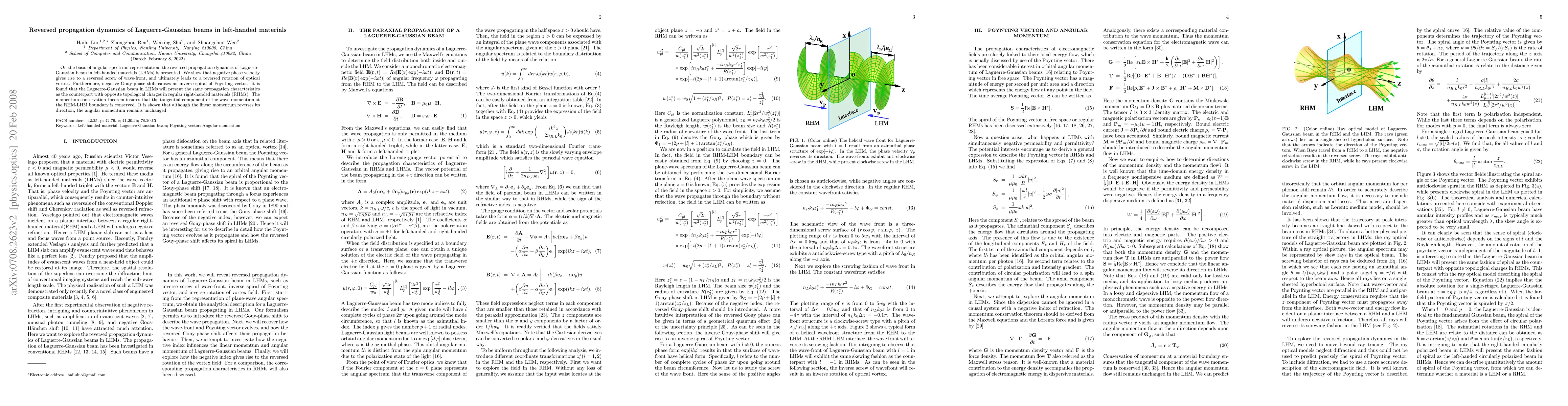 Summary: This paper investigates the reversed propagation dynamics of Laguerre-Gaussian beams in left-handed materials, demonstrating that negative phase velocity leads to a reversed optical vortex rotation and an inverse spiral of the Poynting vector. The study also confirms that the beam's propagation characteristics in left-handed materials mirror those in right-handed materials with opposite topological charges, while conserving angular momentum despite reversed linear momentum.