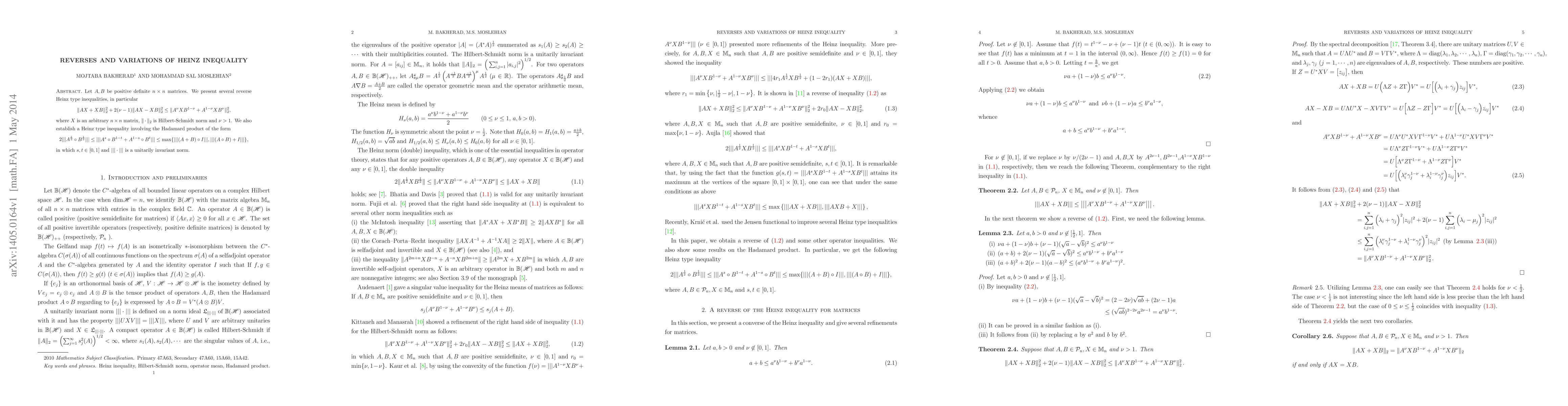 Let $A, B$ be positive definite $n\times n$ matrices. We present several reverse Heinz type inequalities, in particular \begin{align*} \|AX+XB\|_2^2+ 2(\nu-1) \|AX-XB\|_2^2\leq \|A^{\nu}XB^{1-\nu}+A^{1-\nu}XB^{\nu}\|_2^2, \end{align*} where $X$ is an arbitrary $n \times n$ matrix, $\|\cdot\|_2$ is Hilbert-Schmidt norm and $\nu>1$. We also establish a Heinz type inequality involving the Hadamard product of the form \begin{align*} 2|||A^{1\over2}\circ B^{1\over2}|||\leq|||A^{s}\circ B^{1-t}+A^{1-s}\circ B^{t}||| \leq\max\{|||(A+B)\circ I|||,|||(A\circ B)+I|||\}, \end{align*} in which $s, t\in [0,1]$ and $|||\cdot|||$ is a unitarily invariant norm.