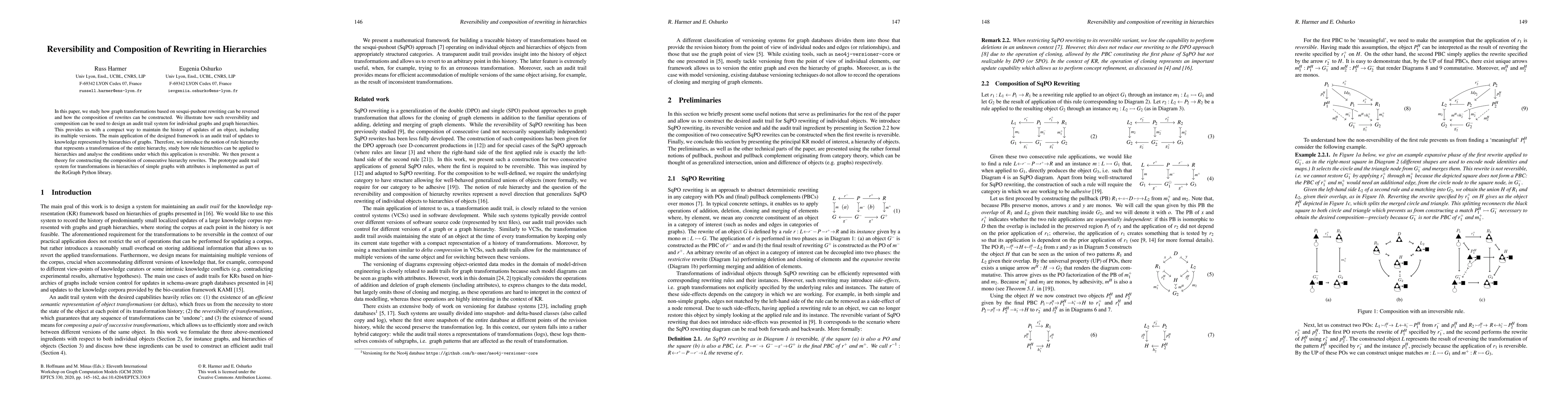 In this paper, we study how graph transformations based on sesqui-pushout rewriting can be reversed and how the composition of rewrites can be constructed. We illustrate how such reversibility and composition can be used to design an audit trail system for individual graphs and graph hierarchies. This provides us with a compact way to maintain the history of updates of an object, including its multiple versions. The main application of the designed framework is an audit trail of updates to knowledge represented by hierarchies of graphs. Therefore, we introduce the notion of rule hierarchy that represents a transformation of the entire hierarchy, study how rule hierarchies can be applied to hierarchies and analyse the conditions under which this application is reversible. We then present a theory for constructing the composition of consecutive hierarchy rewrites. The prototype audit trail system for transformations in hierarchies of simple graphs with attributes is implemented as part of the ReGraph Python library.