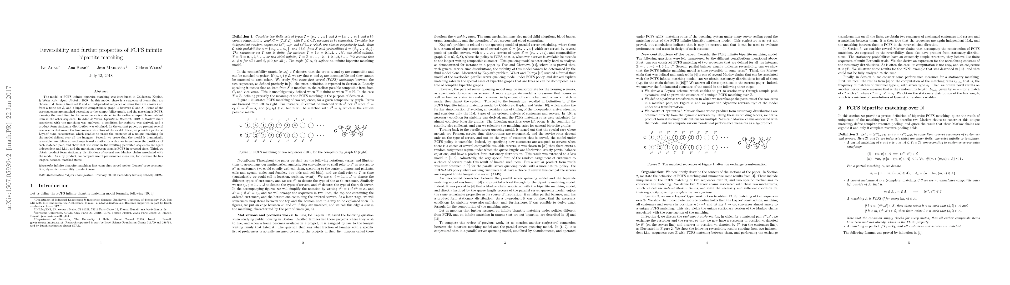 This paper explores the FCFS infinite bipartite matching model, proving the existence of a unique matching and demonstrating its dynamic reversibility. It also derives product form stationary distributions for associated Markov chains, providing performance measures like link lengths.