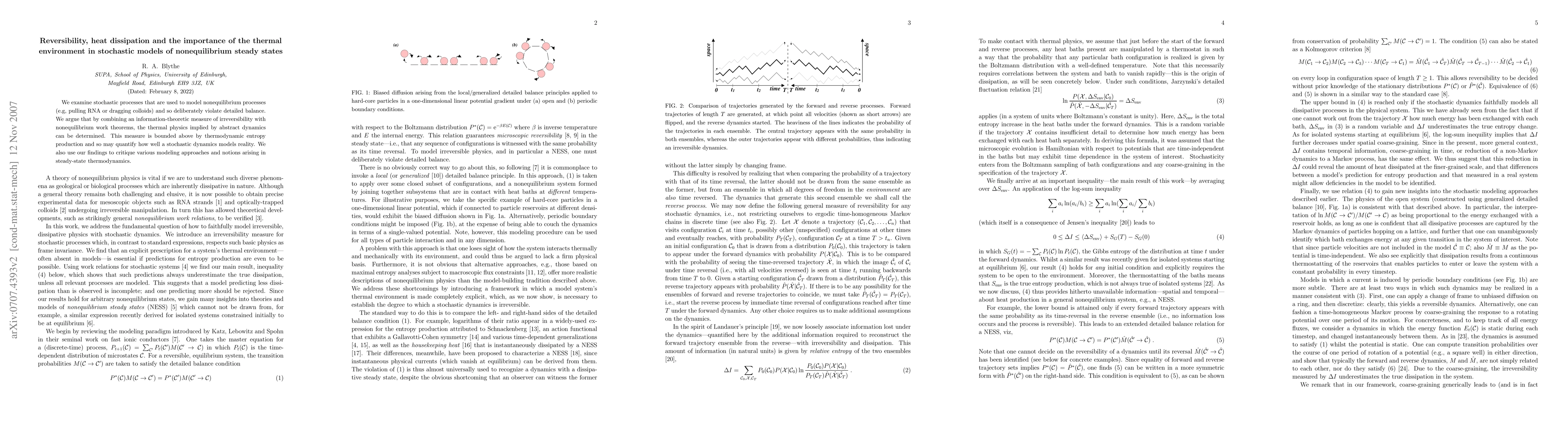 We examine stochastic processes that are used to model nonequilibrium processes (e.g, pulling RNA or dragging colloids) and so deliberately violate detailed balance. We argue that by combining an information-theoretic measure of irreversibility with nonequilibrium work theorems, the thermal physics implied by abstract dynamics can be determined. This measure is bounded above by thermodynamic entropy production and so may quantify how well a stochastic dynamics models reality. We also use our findings to critique various modeling approaches and notions arising in steady-state thermodynamics.