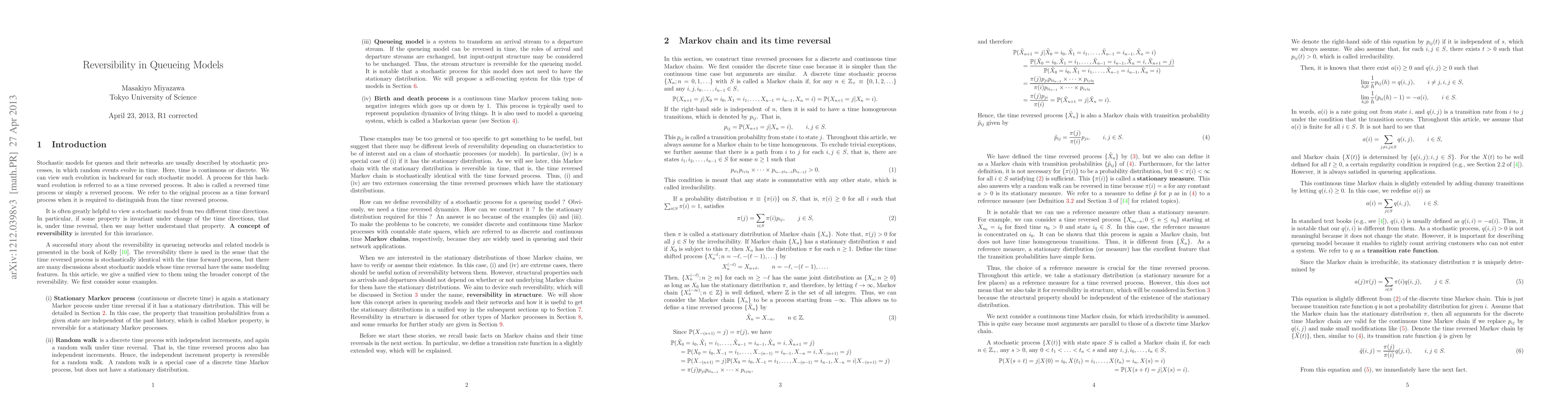 In stochastic models for queues and their networks, random events evolve in time. A process for their backward evolution is referred to as a time reversed process. It is often greatly helpful to view a stochastic model from two different time directions. In particular, if some property is unchanged under time reversal, we may better understand that property. A concept of reversibility is invented for this invariance. Local balance for a stationary Markov chain has been used for a weaker version of the reversibility. However, it is still too strong for queueing applications. We are concerned with a continuous time Markov chain, but dose not assume it has the stationary distribution. We define reversibility in structure as an invariant property of a family of the set of models under certain operation. The member of this set is a pair of transition rate function and its supporting measure, and each set represents dynamics of queueing systems such as arrivals and departures. We use a permutation {\Gamma} of the family menmbers, that is, the sets themselves, to describe the change of the dynamics under time reversal. This reversibility is is called {\Gamma}-reversibility in structure. To apply these definitions, we introduce new classes of models, called reacting systems and self-reacting systems. Using those definitions and models, we give a unified view for queues and their networks which have reversibility in structure, and show how their stationary distributions can be obtained. They include symmetric service, batch movements and state dependent routing.