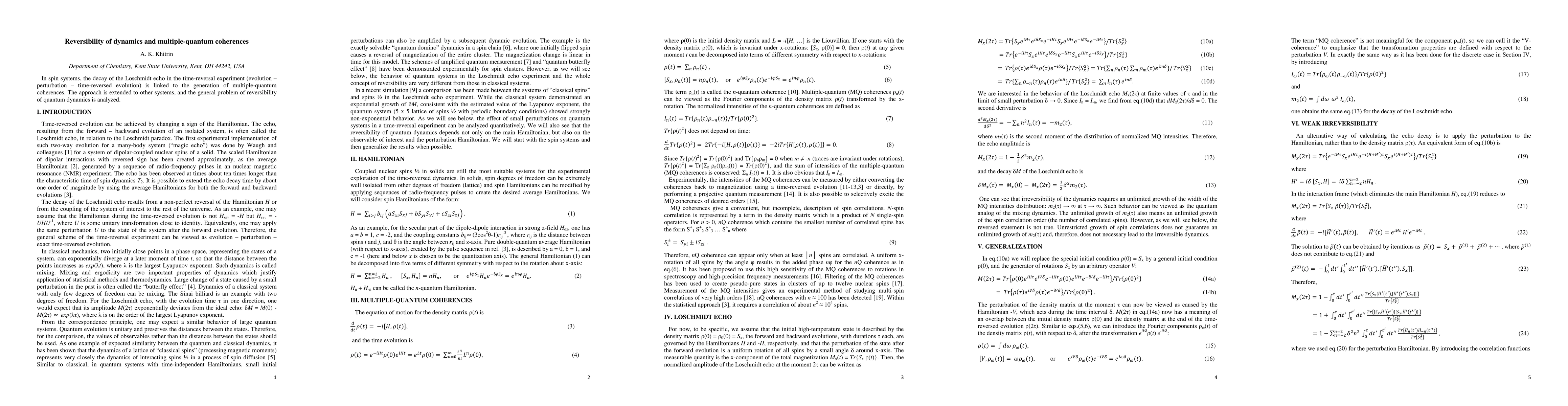 In spin systems, the decay of the Loschmidt echo in the time-reversal experiment (evolution, perturbation, time-reversed evolution) is linked to the generation of multiple-quantum coherences. The approach is extended to other systems, and the general problem of reversibility of quantum dynamics is analyzed.