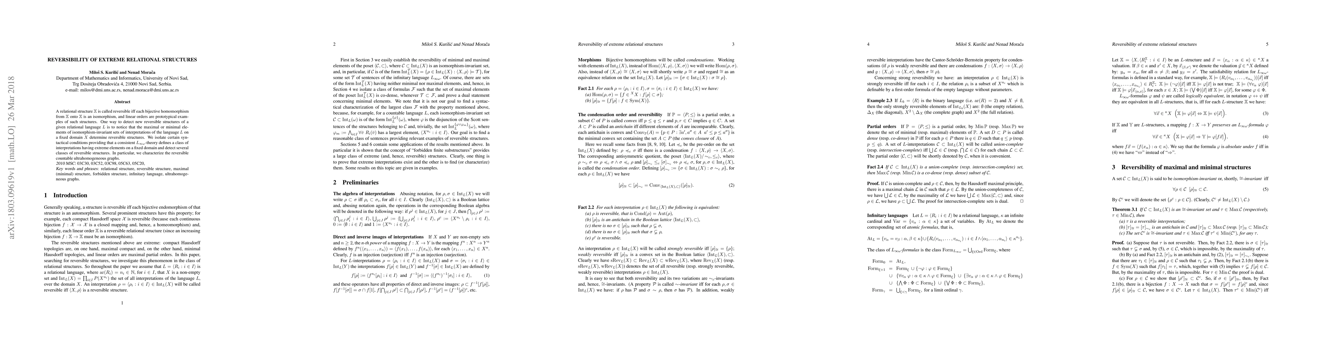 A relational structure $\mathbb{X}$ is called reversible iff each bijective homomorphism from $\mathbb{X}$ onto $\mathbb{X}$ is an isomorphism, and linear orders are prototypical examples of such structures. One way to detect new reversible structures of a given relational language $L$ is to notice that the maximal or minimal elements of isomorphism-invariant sets of interpretations of the language $L$ on a fixed domain $X$ determine reversible structures. We isolate certain syntactical conditions providing that a consistent $L_{\infty \omega }$-theory defines a class of interpretations having extreme elements on a fixed domain and detect several classes of reversible structures. In particular, we characterize the reversible countable ultrahomogeneous graphs.