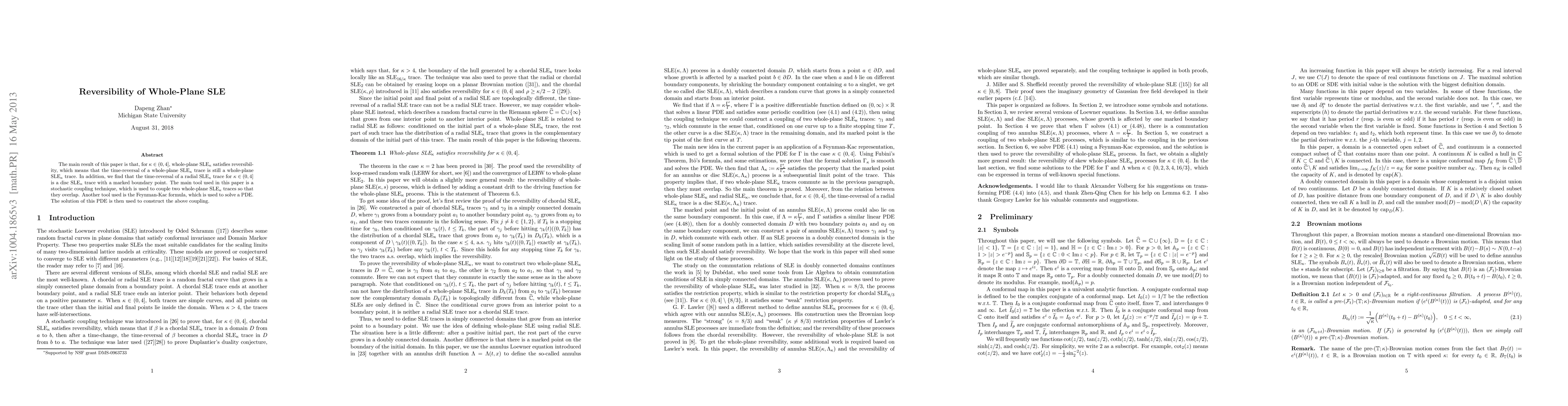 This paper demonstrates that whole-plane SLE$_\kappa$ traces for $\kappa\in(0,4]$ are reversible, meaning their time-reversed paths are also whole-plane SLE$_\kappa$ traces. Additionally, it shows that reversed radial SLE$_\kappa$ traces correspond to disc SLE$_\kappa$ with a marked boundary point. The study employs stochastic coupling and the Feynman-Kac formula to achieve these results.
