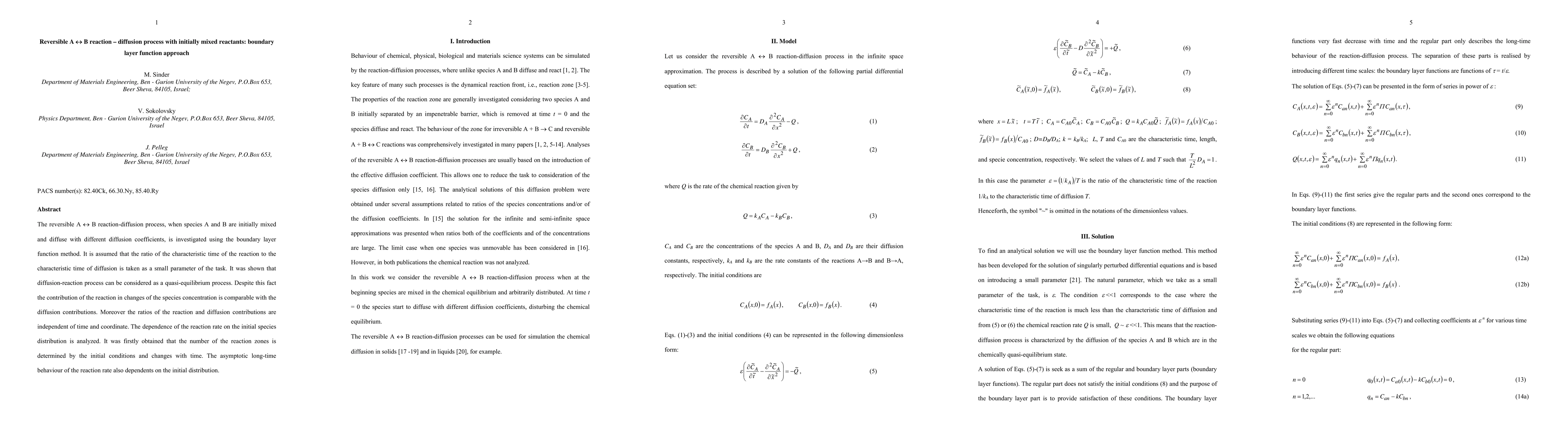 This paper investigates the reversible A <-> B reaction-diffusion process with initially mixed reactants using the boundary layer function method. It finds that the process can be treated as quasi-equilibrium, with reaction and diffusion contributions to concentration changes being comparable and independent of time and space.