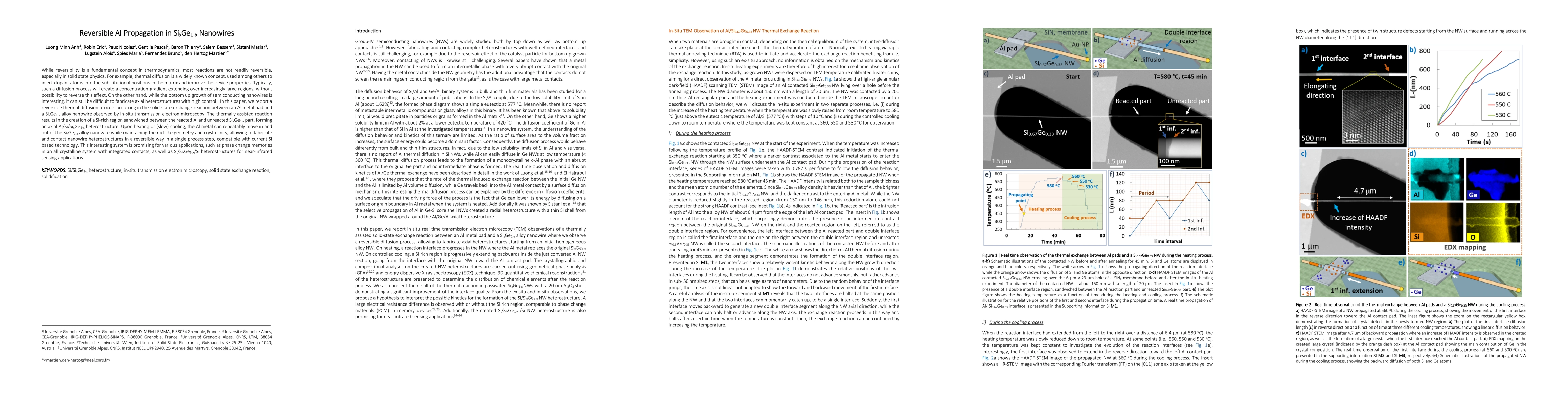 While reversibility is a fundamental concept in thermodynamics, most reactions are not readily reversible, especially in solid state physics. For example, thermal diffusion is a widely known concept, used among others to inject dopant atoms into the substitutional positions in the matrix and improve the device properties. Typically, such a diffusion process will create a concentration gradient extending over increasingly large regions, without possibility to reverse this effect. On the other hand, while the bottom up growth of semiconducting nanowires is interesting, it can still be difficult to fabricate axial heterostructures with high control. In this paper, we report a reversible thermal diffusion process occurring in the solid-state exchange reaction between an Al metal pad and a Si$_x$Ge$_{1-x}$ alloy nanowire observed by in-situ transmission electron microscopy. The thermally assisted reaction results in the creation of a Si-rich region sandwiched between the reacted Al and unreacted SixGe1-x part, forming an axial Al/Si/Si$_x$Ge$_{1-x}$ heterostructure. Upon heating or (slow) cooling, the Al metal can repeatably move in and out of the Si$_x$Ge$_{1-x}$ alloy nanowire while maintaining the rod-like geometry and crystallinity, allowing to fabricate and contact nanowire heterostructures in a reversible way in a single process step, compatible with current Si based technology. This interesting system is promising for various applications, such as phase change memories in an all crystalline system with integrated contacts, as well as Si/Si$_x$Ge$_{1-x}$/Si heterostructures for near-infrared sensing applications.