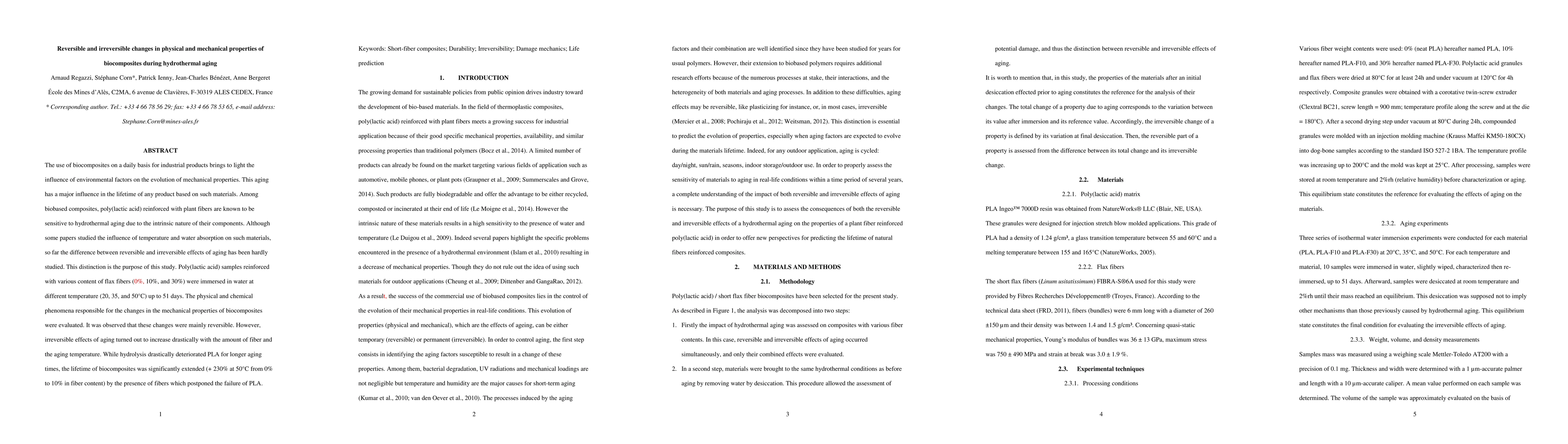 This study investigates the reversible and irreversible effects of hydrothermal aging on biocomposites of poly(lactic acid) reinforced with flax fibers, finding that while most changes are reversible, the presence of fibers and higher aging temperatures lead to significant irreversible deterioration. The addition of fibers notably extends the lifetime of biocomposites by delaying PLA failure.