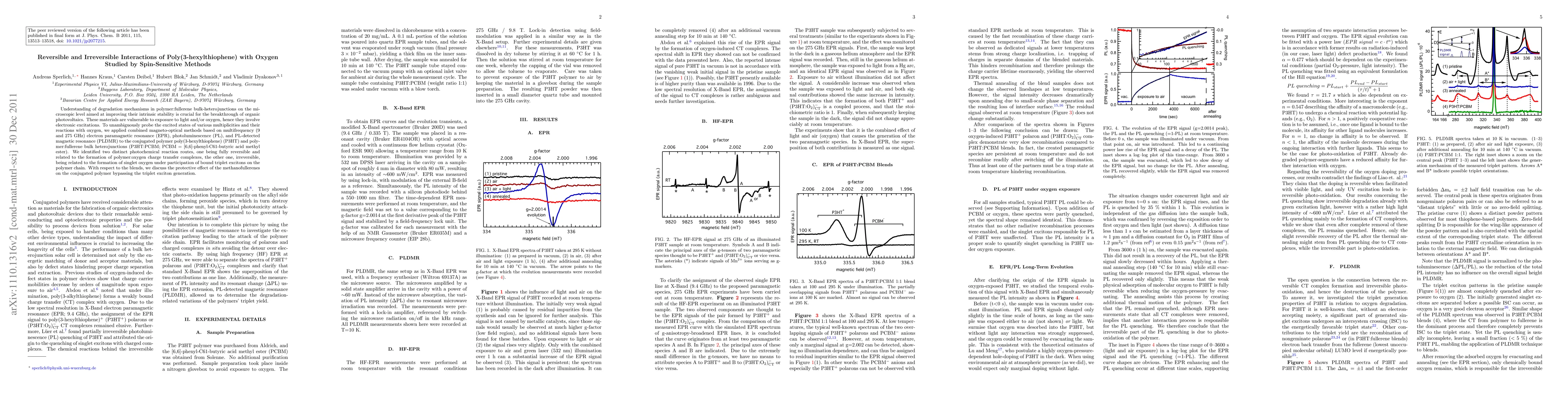 This study investigates the degradation mechanisms of poly(3-hexylthiophene) (P3HT) and P3HT:PCBM blends under oxygen exposure using spin-sensitive methods. The research identifies reversible charge transfer interactions and irreversible singlet oxygen formation, highlighting the protective role of methanofullerenes in preventing triplet exciton generation.