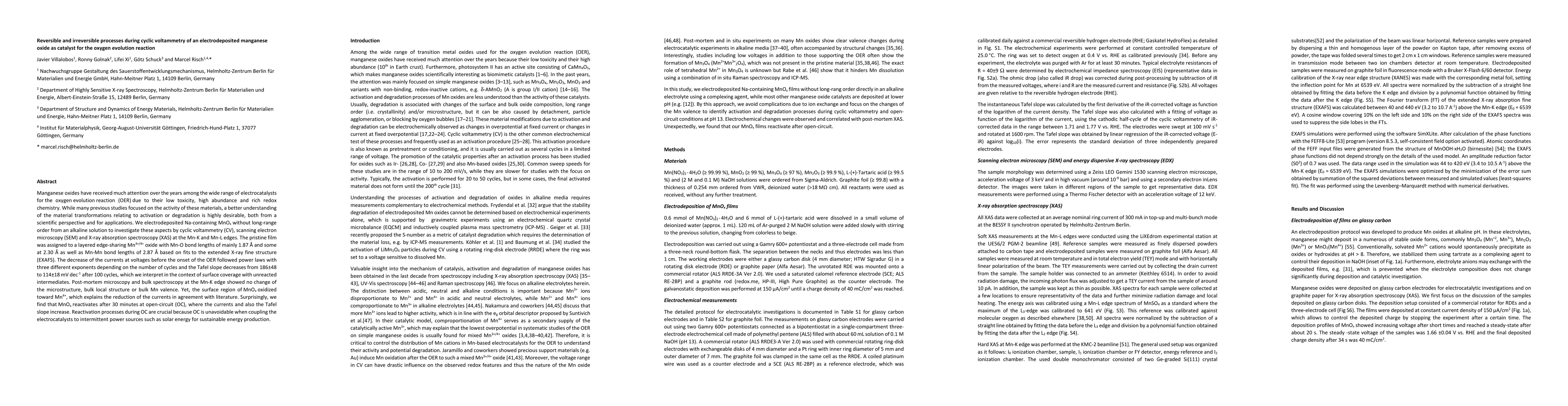 Researchers investigated the reversible and irreversible processes of manganese oxide electrodes used in oxygen evolution reactions through cyclic voltammetry, revealing a 30-minute reactivation process after open-circuit conditions.