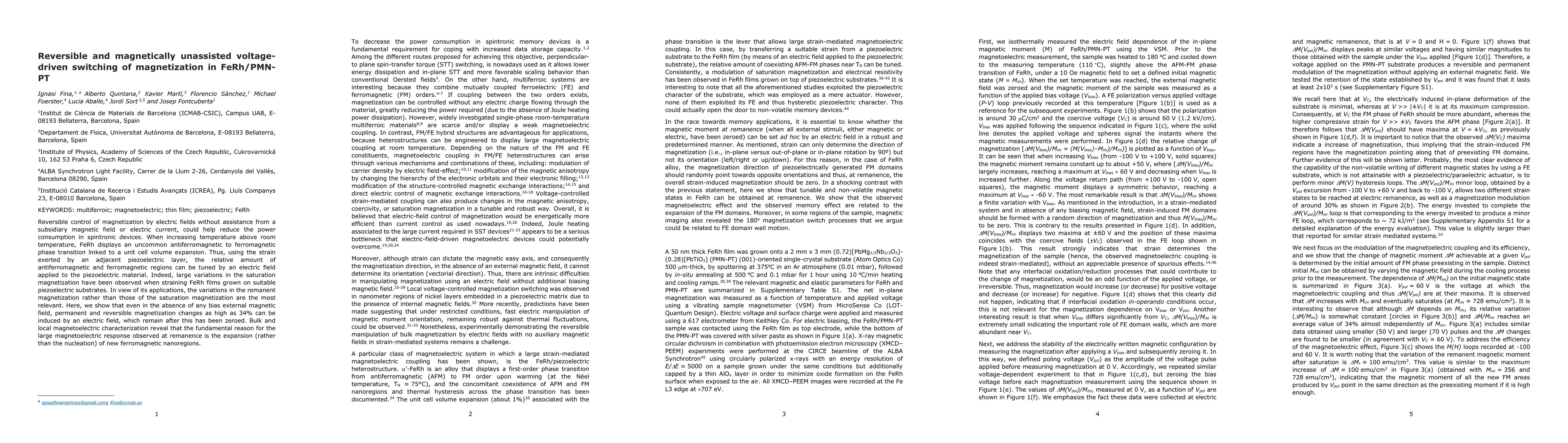 This paper demonstrates reversible and magnetically unassisted voltage-driven switching of magnetization in FeRh/PMN-PT heterostructures, achieving up to 34% change in remanent magnetization via electric fields without external magnetic fields, driven by strain-induced expansion of ferromagnetic regions.