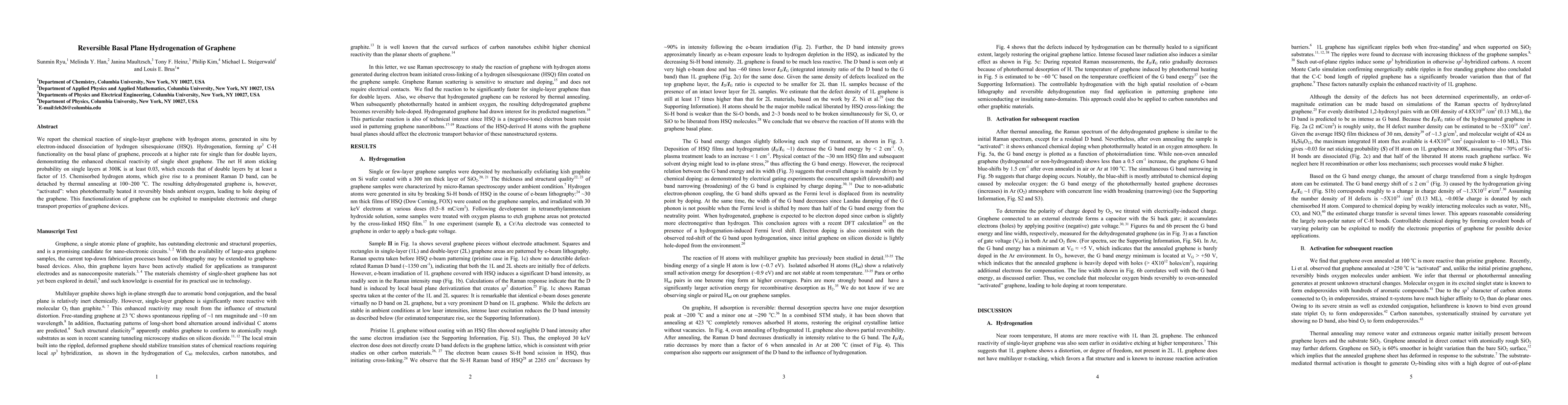 We report the chemical reaction of single-layer graphene with hydrogen atoms, generated in situ by electron-induced dissociation of hydrogen silsesquioxane (HSQ). Hydrogenation, forming sp3 C-H functionality on the basal plane of graphene, proceeds at a higher rate for single than for double layers, demonstrating the enhanced chemical reactivity of single sheet graphene. The net H atom sticking probability on single layers at 300 K is at least 0.03, which exceeds that of double layers by at least a factor of 15. Chemisorbed hydrogen atoms, which give rise to a prominent Raman D band, can be detached by thermal annealing at 100~200 degrees C. The resulting dehydrogenated graphene is "activated" when photothermally heated it reversibly binds ambient oxygen, leading to hole doping of the graphene. This functionalization of graphene can be exploited to manipulate electronic and charge transport properties of graphene devices.
