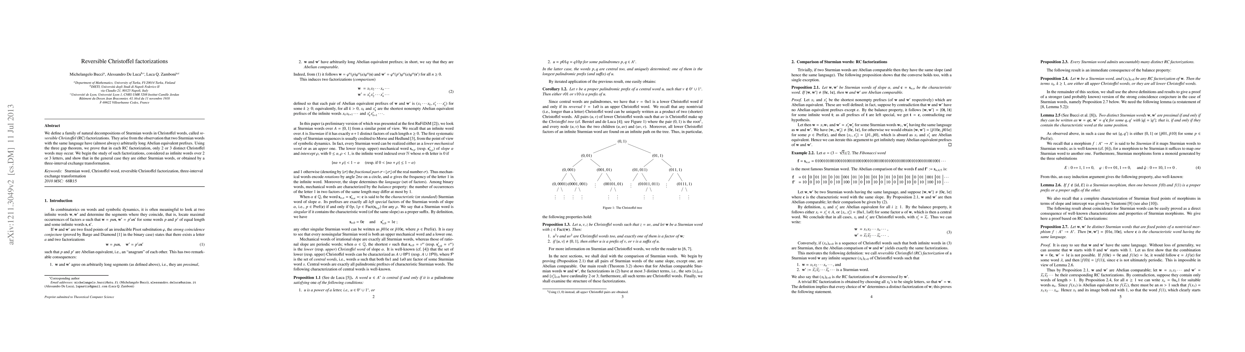 We define a family of natural decompositions of Sturmian words in Christoffel words, called *reversible Christoffel* (RC) factorizations. They arise from the observation that two Sturmian words with the same language have (almost always) arbitrarily long Abelian equivalent prefixes. Using the three gap theorem, we prove that in each RC factorization, only 2 or 3 distinct Christoffel words may occur. We begin the study of such factorizations, considered as infinite words over 2 or 3 letters, and show that in the general case they are either Sturmian words, or obtained by a three-interval exchange transformation.