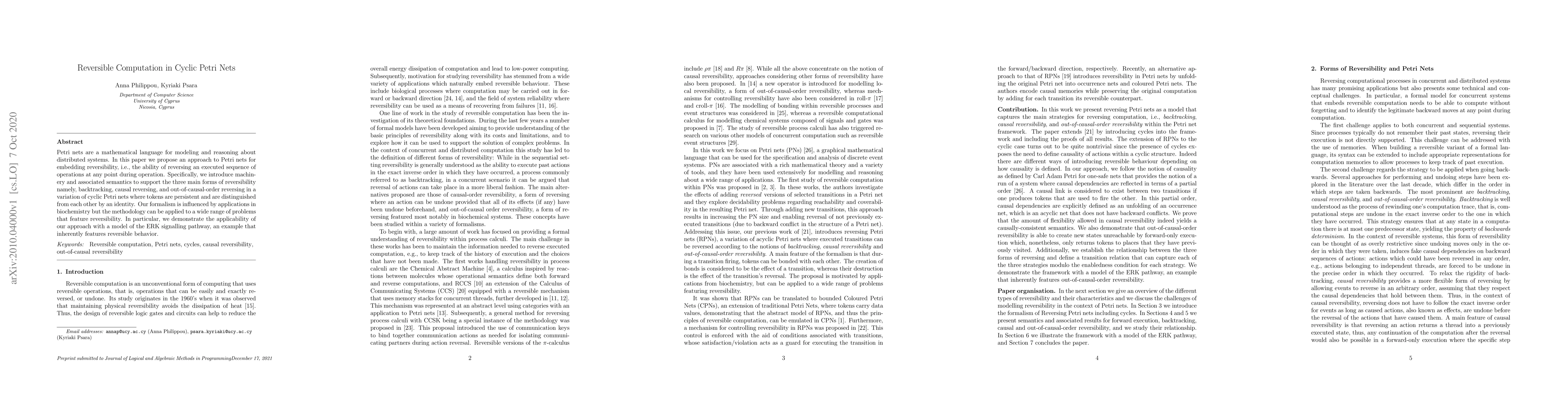 This paper proposes a method to embed reversibility in cyclic Petri nets, enabling backtracking, causal reversing, and out-of-causal-order reversing, with persistent tokens distinguished by identity. The approach is demonstrated through a model of the ERK signalling pathway, showcasing its applicability to systems with inherent reversible behavior.