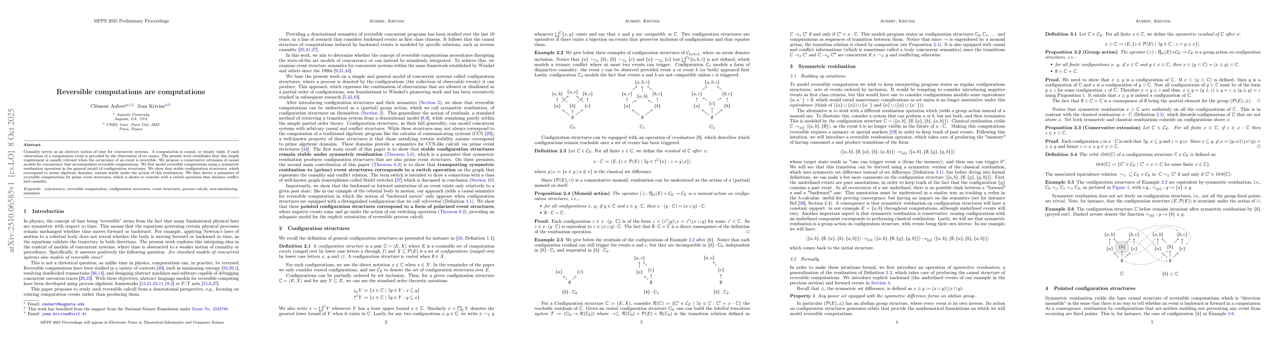 Causality serves as an abstract notion of time for concurrent systems. A computation is causal, or simply valid, if each observation of a computation event is preceded by the observation of its causes. The present work establishes that this simple requirement is equally relevant when the occurrence of an event is invertible. We propose a conservative extension of causal models for concurrency that accommodates reversible computations. We first model reversible computations using a symmetric residuation operation in the general model of configuration structures. We show that stable configuration structures, which correspond to prime algebraic domains, remain stable under the action of this residuation. We then derive a semantics of reversible computations for prime event structures, which is shown to coincide with a switch operation that dualizes conflict and causality.