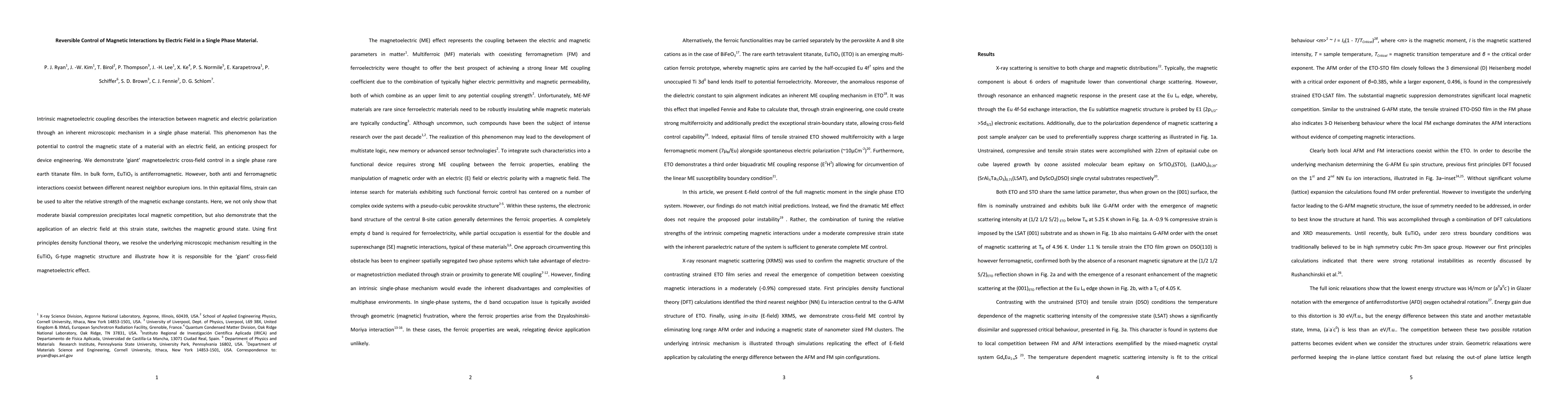 This paper demonstrates reversible control of magnetic interactions in a single phase rare earth titanate film using an electric field, revealing a 'giant' magnetoelectric effect. The study shows that strain and an electric field can switch the magnetic ground state in EuTiO3, revealing the microscopic mechanism behind its G-type magnetic structure via density functional theory.