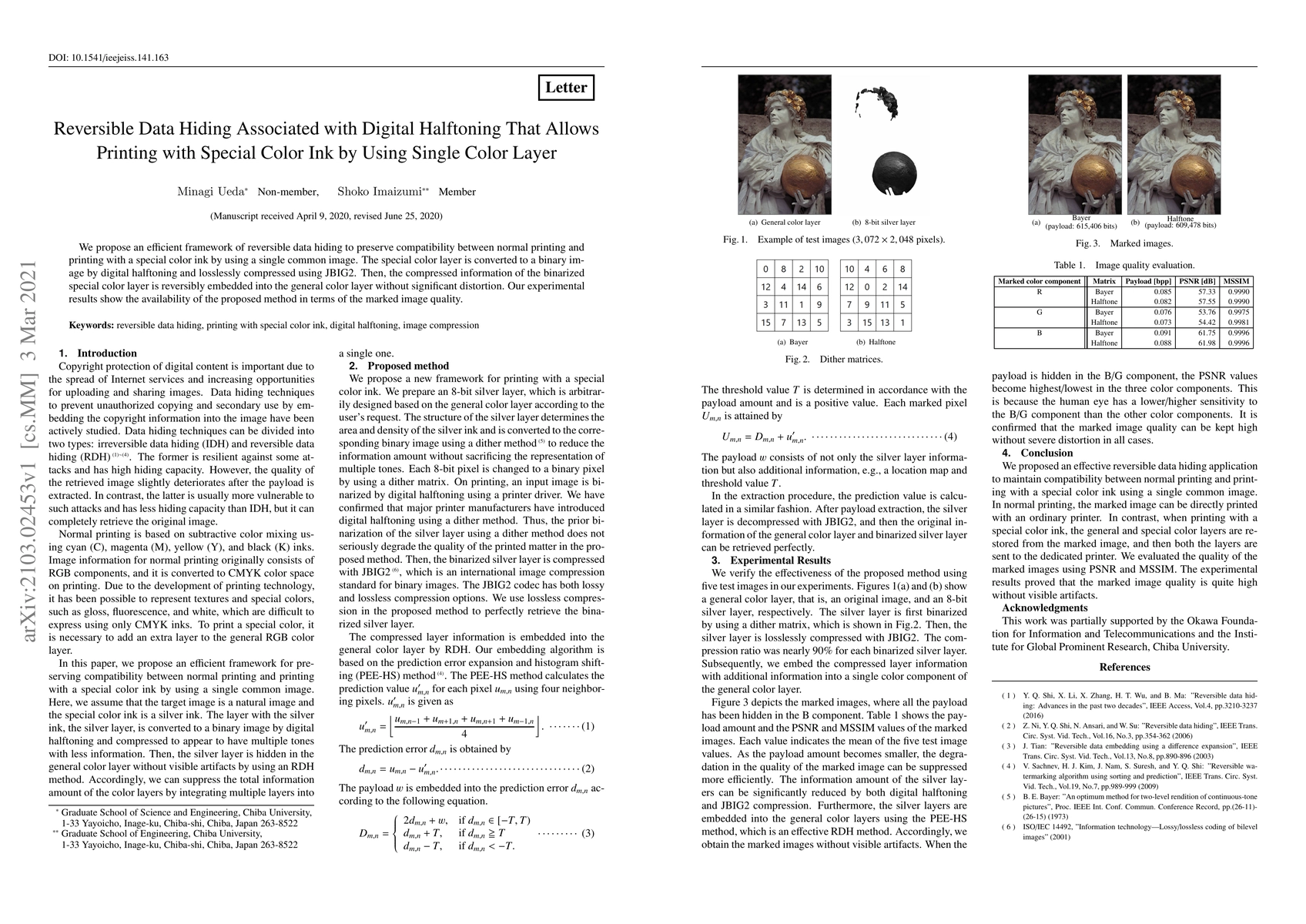 The method uses reversible data hiding, lossless compression, and embedding to preserve the original image, making it suitable for applications requiring both normal and special color print capabilities.