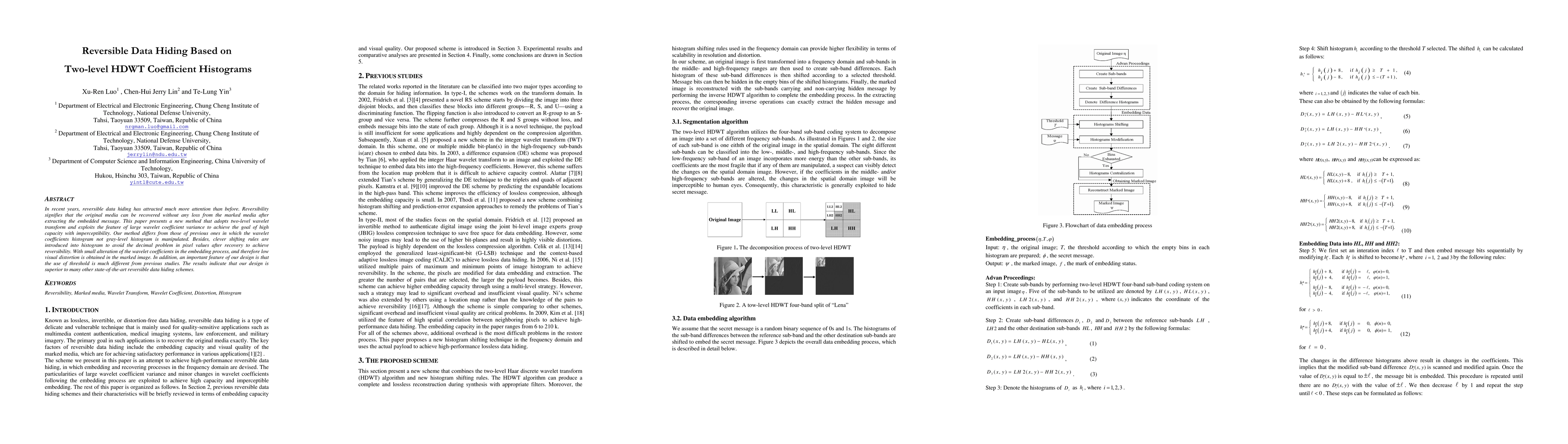 This paper proposes a reversible data hiding method using a two-level wavelet transform and histogram manipulation of wavelet coefficient variances for high-capacity embedding with minimal visual distortion. The method employs clever shifting rules to ensure reversibility and differs from previous methods by focusing on wavelet coefficient histograms rather than gray-level histograms.