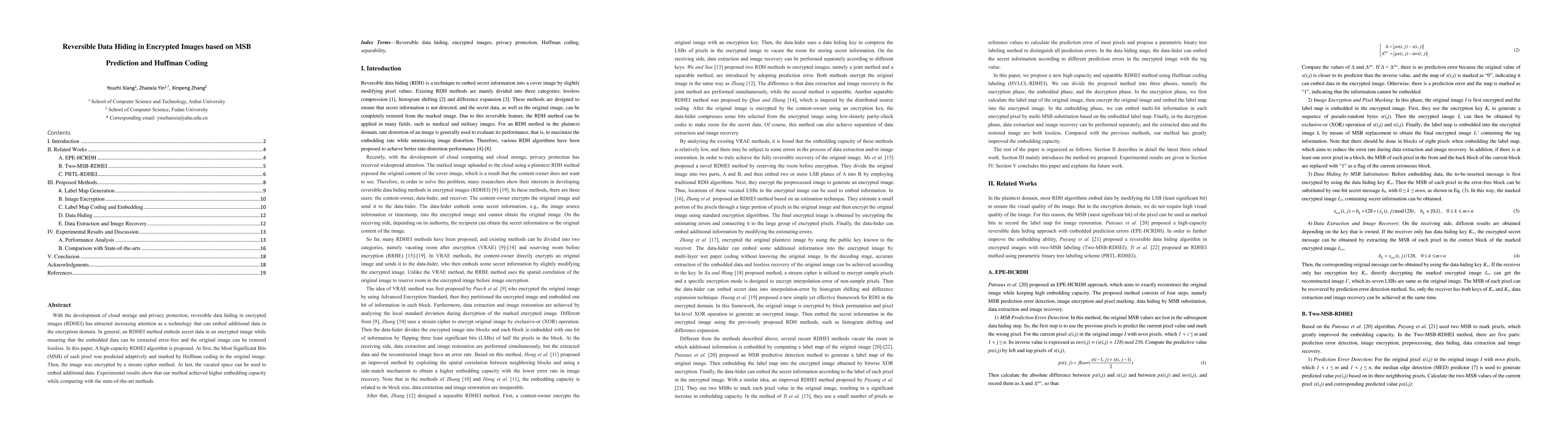 This paper proposes a high-capacity reversible data hiding algorithm for encrypted images using MSB prediction and Huffman coding. The method predicts MSBs in the original image, encrypts it, and then embeds additional data in the vacated space, achieving higher embedding capacity compared to existing methods.