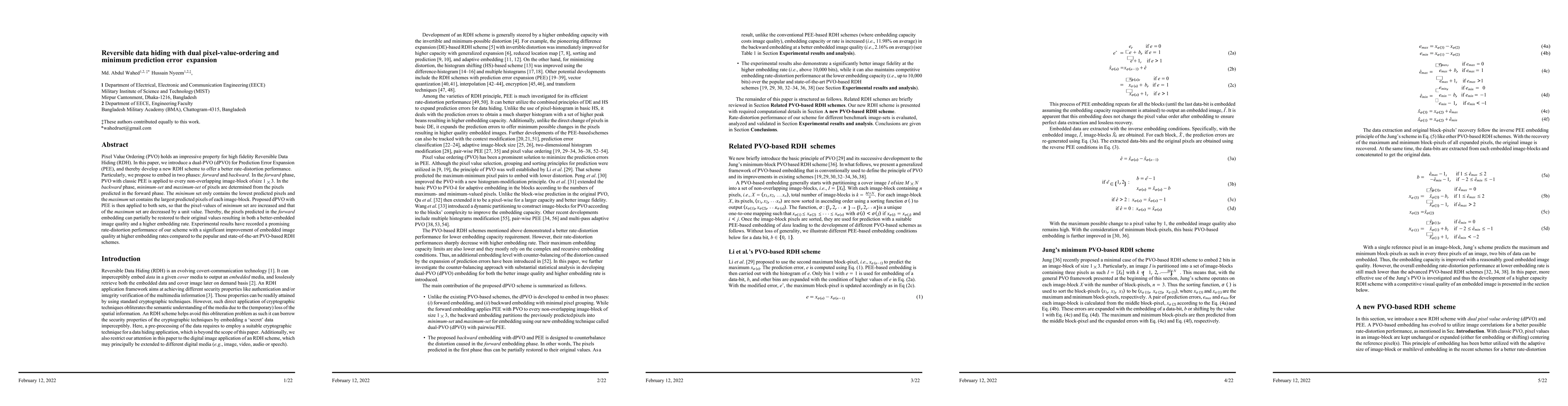 This paper proposes a dual-Pixel Value Ordering (dPVO) method combined with Prediction Error Expansion (PEE) for Reversible Data Hiding (RDH), achieving better rate-distortion performance. The method embeds data in two phases: forward and backward, optimizing pixel values to enhance image quality and embedding rate.