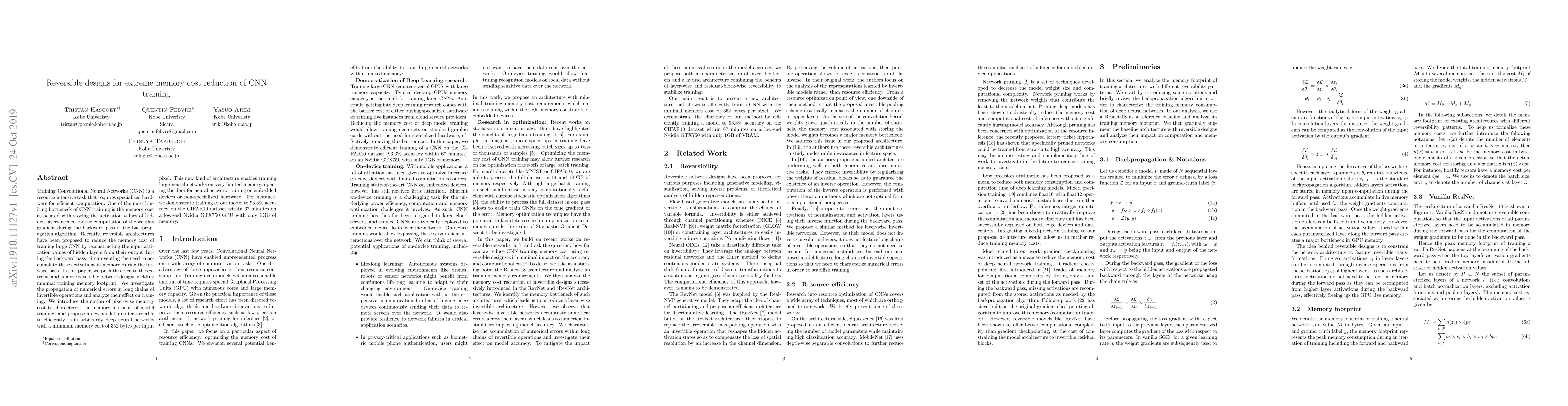 This paper proposes reversible network designs to minimize memory cost during CNN training, achieving a minimal memory footprint of 352 bytes per input pixel. The study demonstrates training large neural networks on limited memory hardware, achieving 93.3% accuracy on CIFAR10 using a 1GB GPU in 67 minutes.