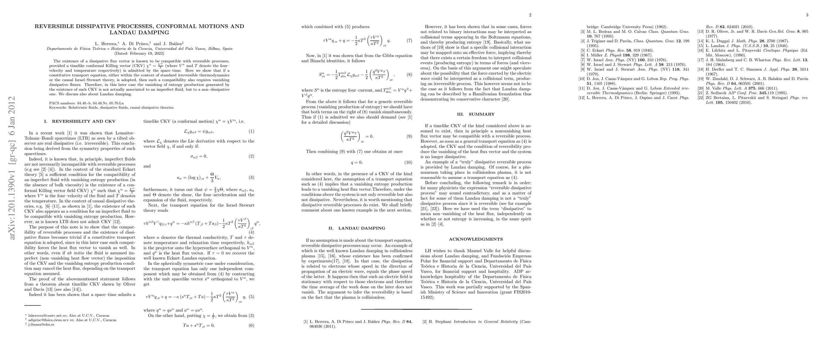 This paper explores the compatibility of dissipative flux vectors with reversible processes in the presence of a timelike conformal Killing vector. It concludes that adopting a constitutive transport equation leads to vanishing dissipative fluxes, indicating that the absence of entropy production is due to non-dissipative rather than imperfect fluids. The paper also discusses Landau damping in this context.