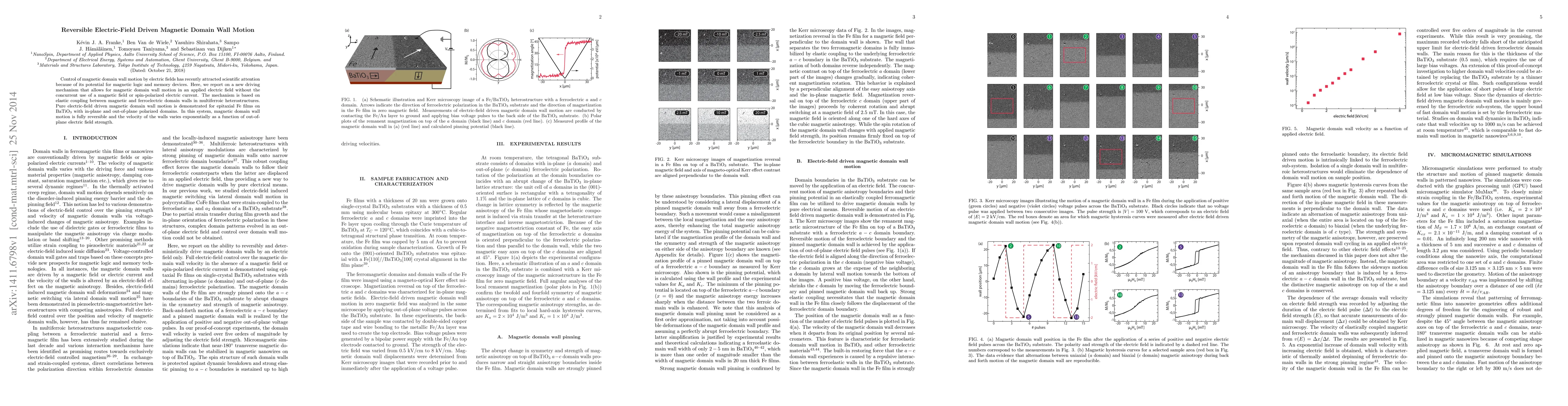 This paper introduces a novel reversible electric-field driven mechanism for magnetic domain wall motion in multiferroic heterostructures, eliminating the need for magnetic fields or spin-polarized currents. The method employs elastic coupling between magnetic and ferroelectric domains, demonstrated in Fe films on BaTiO$_3$, showing reversible domain wall motion with velocity exponentially dependent on the applied electric field.