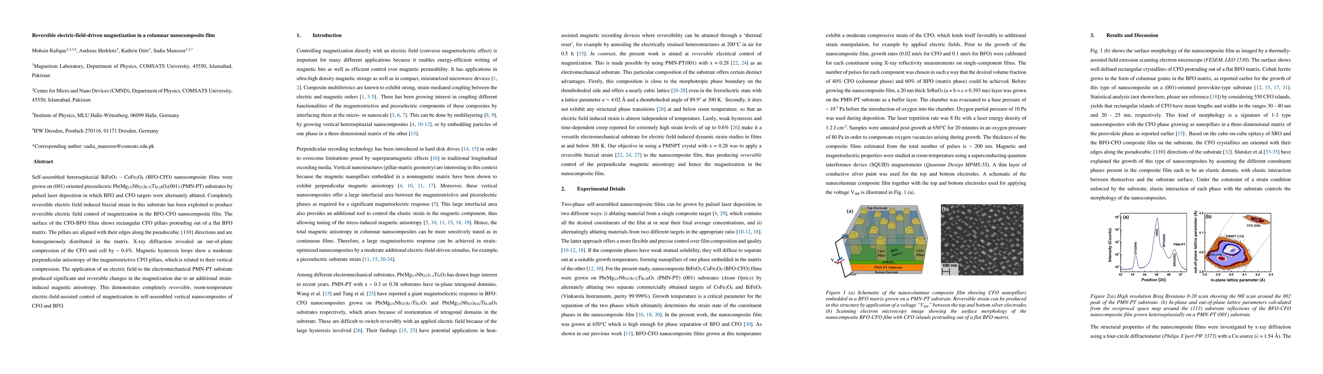 Magnetic hysteresis loops show a moderate perpendicular anisotropy of the magnetostrictive CFO pillars, which is related to their vertical compression. The application of an electric field to the electromechanical PMN-PT substrate produced significant and reversible changes in the magnetization due to an additional strain-induced magnetic anisotropy. This demonstrates completely reversible, room-temperature electric-field-assisted control of magnetization in self-assembled vertical nanocomposites of CFO and BFO.
