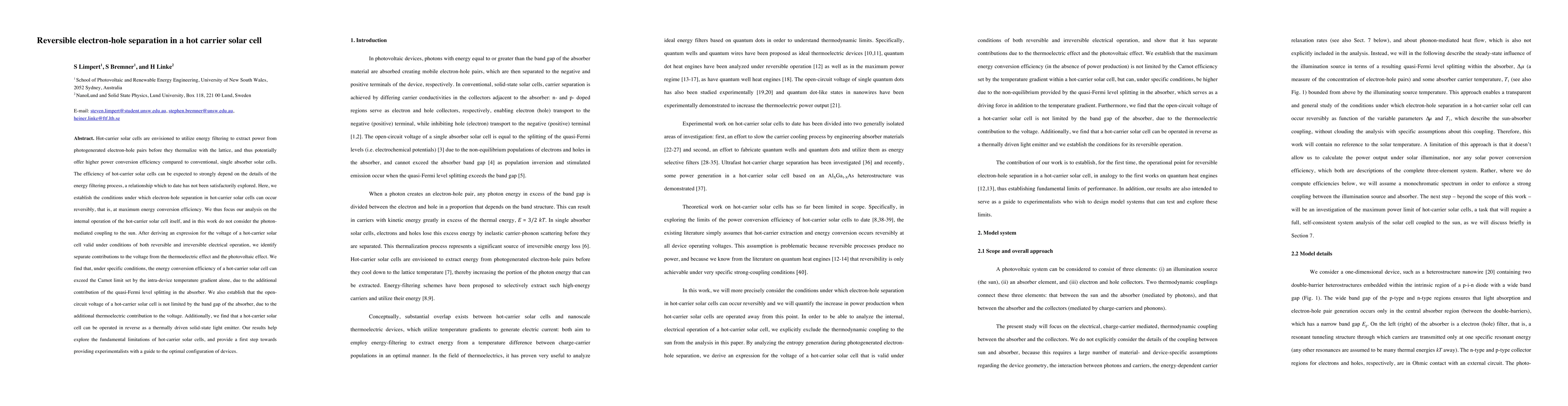 This paper investigates the conditions for reversible electron-hole separation in hot-carrier solar cells, demonstrating that under specific conditions, their efficiency can surpass the Carnot limit, and the open-circuit voltage is not limited by the absorber's band gap. It also reveals the potential for these cells to function as thermally driven light emitters.