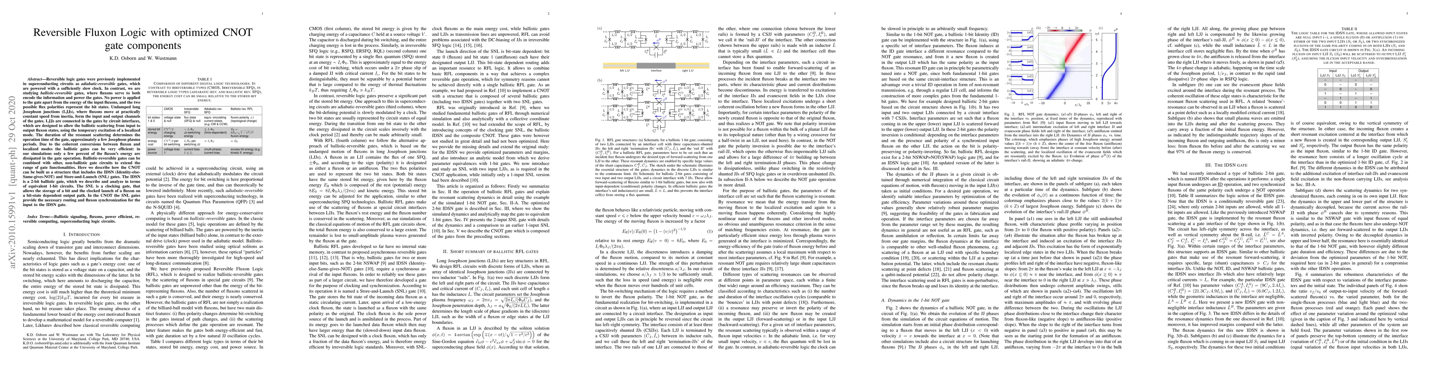 Reversible logic gates were previously implemented in superconducting circuits as adiabatic-reversible gates, which are powered with a sufficiently slow clock. In contrast, we are studying ballistic-reversible gates, where fluxons serve to both encode the information and power the gates. No power is applied to the gate apart from the energy of the input fluxons, and the two possible flux polarities represent the bit states. Undamped long Josephson junctions (LJJs), where fluxons move at practically constant speed from inertia, form the input and output channels of the gates. LJJs are connected in the gates by circuit interfaces, which are designed to allow the ballistic scattering from input to output fluxon states, using the temporary excitation of a localized mode. The duration of the resonant scattering determines the operation time of the gate, approximately a few Josephson plasma periods. Due to the coherent conversions between fluxon and localized modes the ballistic gates can be very efficient: in our simulations only a few percent of the fluxon's energy are dissipated in the gate operation. Ballistic-reversible gates can be combined with other, non-ballistic gate circuits to extend the range of gate functionalities. Here we describe how the CNOT can be built as a structure that includes the IDSN (Identity-else-Same-gives-NOT) and Store-and-Launch (SNL) gates. The IDSN is a 2-bit ballistic gate, which we describe and analyze in terms of equivalent 1-bit circuits. The SNL is a clocking gate, that allows the storage of a bit and the clocked launch of a fluxon on a bit-state dependent output path. In the CNOT the SNL gates provide the necessary routing and fluxon synchronization for the input to the IDSN gate.