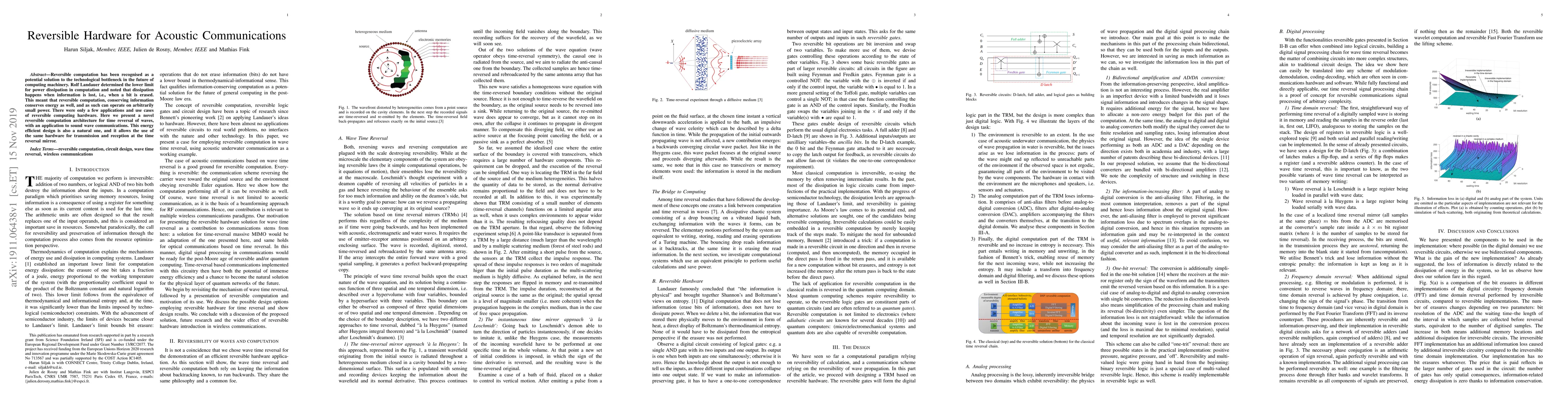 Reversible computation has been recognised as a potential solution to the technological bottleneck in the future of computing machinery. Rolf Landauer determined the lower limit for power dissipation in computation and noted that dissipation happens when information is lost, i.e., when a bit is erased. This meant that reversible computation, conserving information conserves energy as well, and as such can operate on arbitrarily small power. There were only a few applications and use cases of reversible computing hardware. Here we present a novel reversible computation architecture for time reversal of waves, with an application to sound wave communications. This energy efficient design is also a natural one, and it allows the use of the same hardware for transmission and reception at the time reversal mirror.