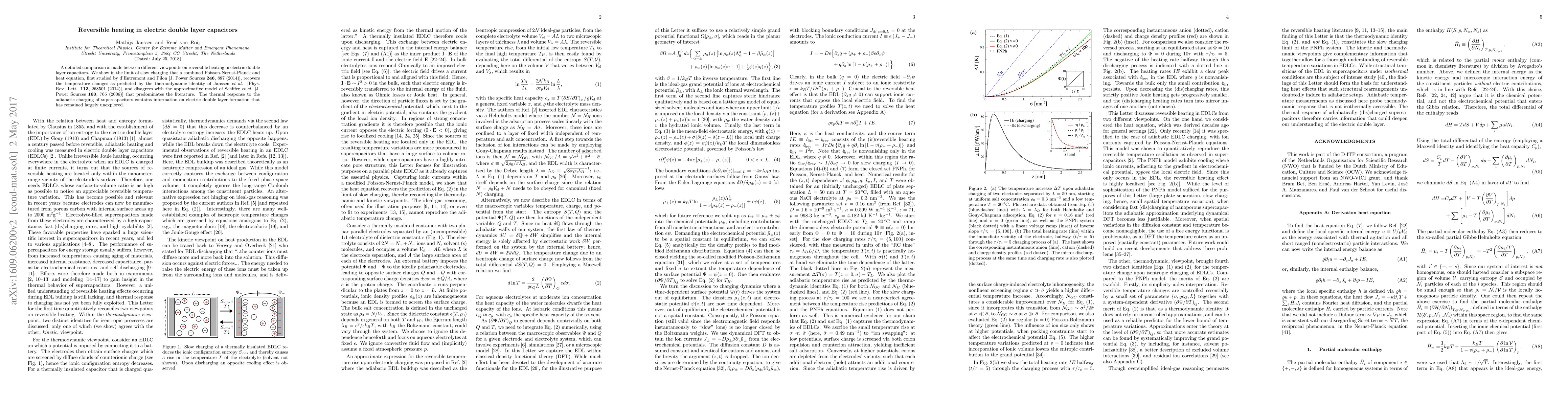 A detailed comparison is made between different viewpoints on reversible heating in electric double layer capacitors. We show in the limit of slow charging that a combined Poisson-Nernst-Planck and heat equation, first studied by d'Entremont and Pilon [J. Power Sources {\bf 246}, 887 (2014)], recovers the temperature changes as predicted by the thermodynamic identity of Janssen, H\"{a}rtel, and van Roij [Phys. Rev. Lett. {\bf 113}, 268501 (2014)], and disagrees with the approximative model of Schiffer, Linzen, and Sauer [J. Power Sources {\bf 160}, 765 (2006)] that predominates the literature.