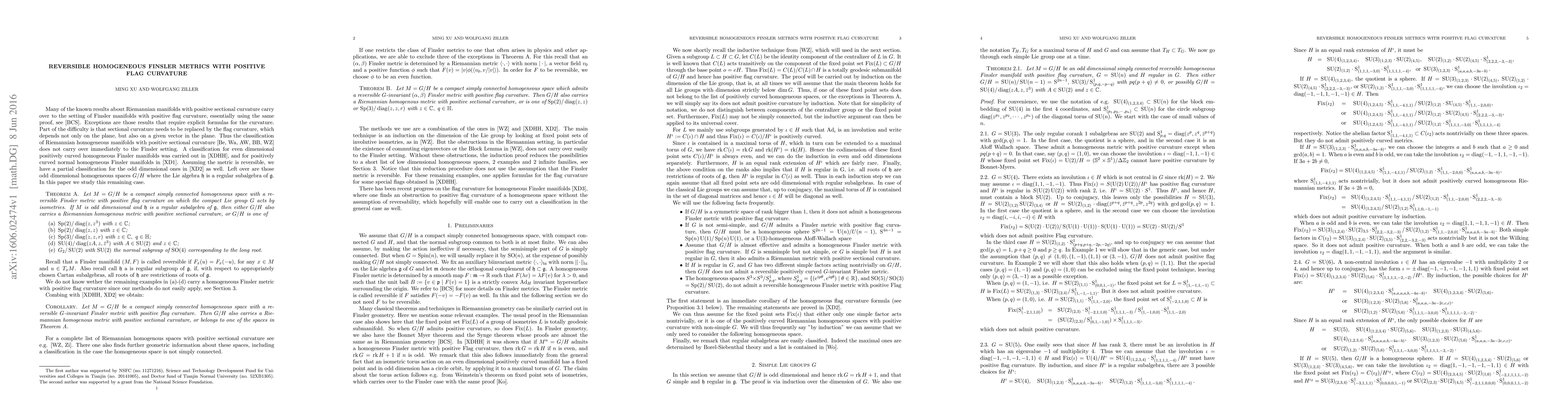 We classify homogeneous reversible Finsler metrics with positive Flag curvature. We show that if G/H admits a G invariant reversible Finsler metric with positive Flag curvature, then up to a few low dimensional spaces, it also admits a G invariant Riemannian metric with positive sectional curvature. For the exceptions, we do not know if they admit homogeneous Finsler metrics with positive Flag curvature.