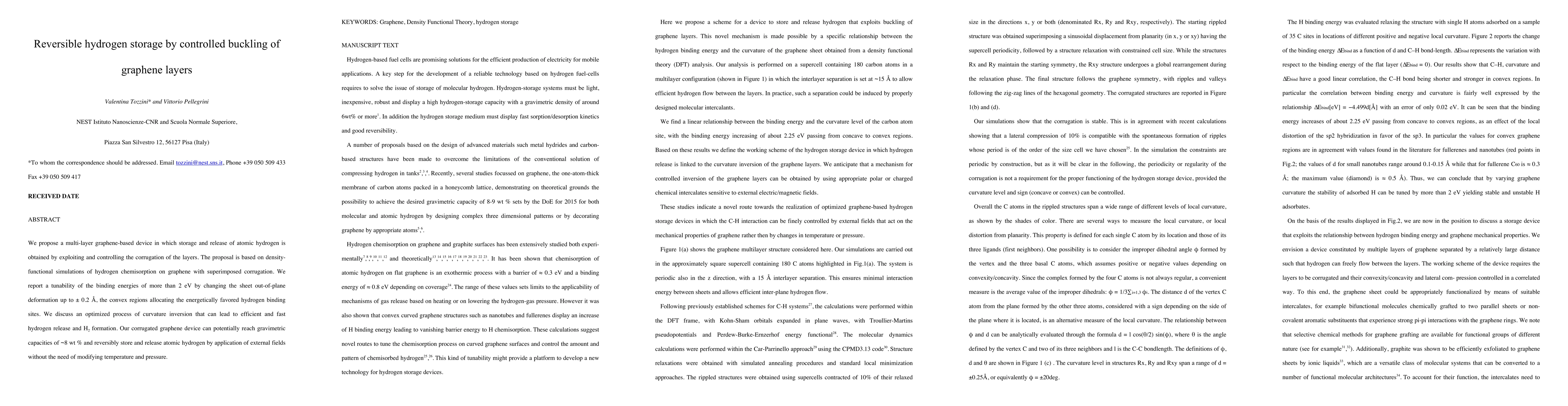 This paper proposes a multi-layer graphene device for reversible hydrogen storage by controlling the buckling of graphene layers, achieving tunability of hydrogen binding energies up to 2 eV. The device can store and release hydrogen efficiently through curvature inversion, potentially reaching gravimetric capacities of ~8 wt % without altering temperature or pressure.