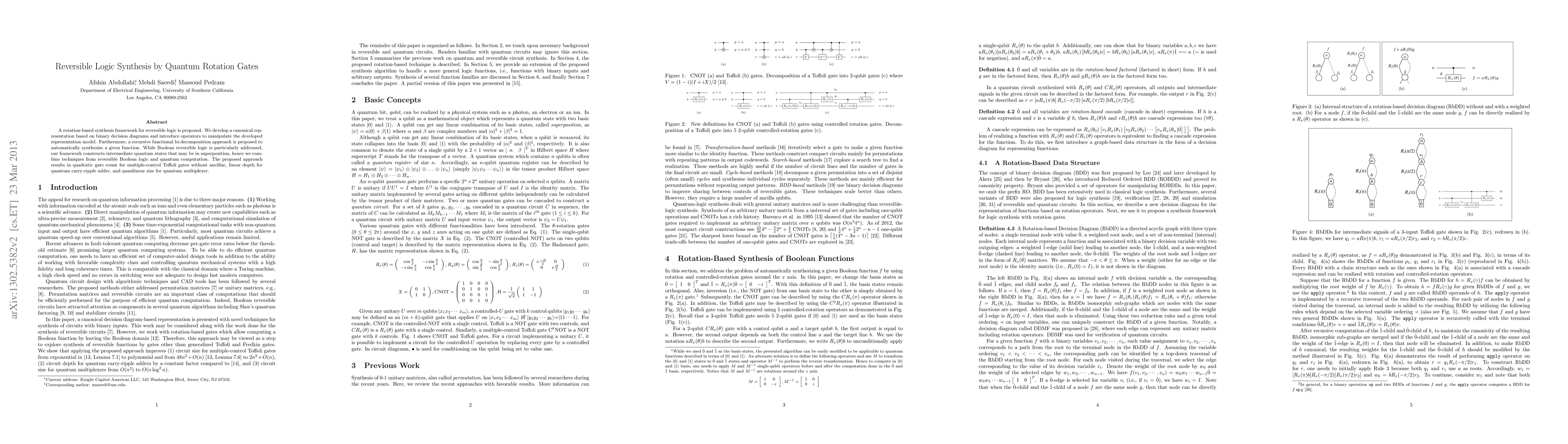 This paper introduces a novel synthesis framework for reversible logic using quantum rotation gates, combining reversible Boolean logic with quantum computation. The proposed method efficiently synthesizes functions using a recursive functional bi-decomposition approach, achieving quadratic gate count for multiple-control Toffoli gates and linear depth for quantum carry-ripple adders.
