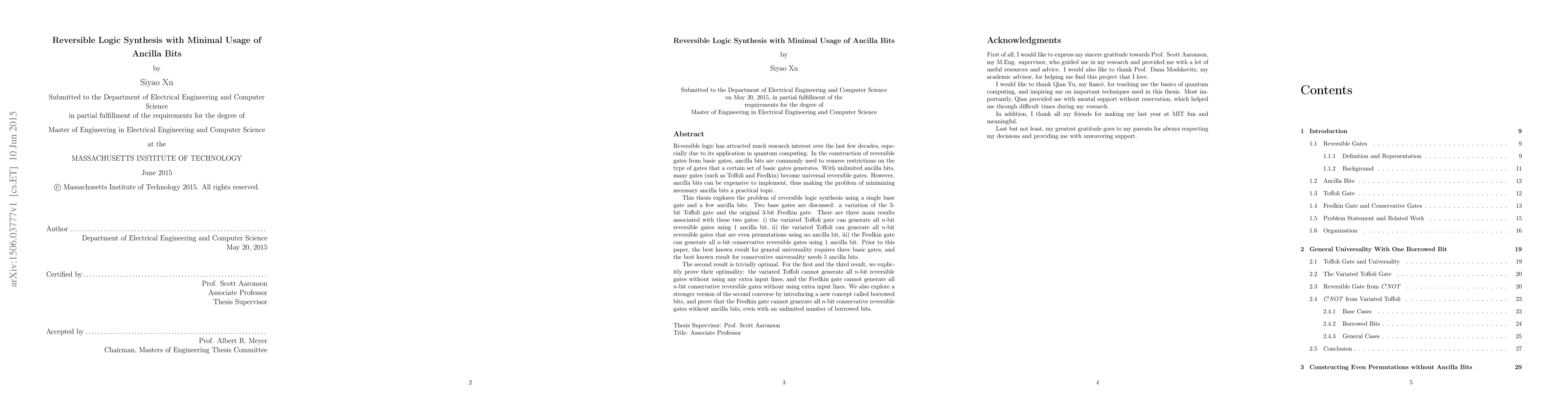 Reversible logic has attracted much research interest over the last few decades, especially due to its application in quantum computing. In the construction of reversible gates from basic gates, ancilla bits are commonly used to remove restrictions on the type of gates that a certain set of basic gates generates. With unlimited ancilla bits, many gates (such as Toffoli and Fredkin) become universal reversible gates. However, ancilla bits can be expensive to implement, thus making the problem of minimizing necessary ancilla bits a practical topic. This thesis explores the problem of reversible logic synthesis using a single base gate and a few ancilla bits. Two base gates are discussed: a variation of the 3-bit Toffoli gate and the original 3-bit Fredkin gate. There are three main results associated with these two gates: i) the variated Toffoli gate can generate all n-bit reversible gates using 1 ancilla bit, ii) the variated Toffoli can generate all n-bit reversible gates that are even permutations using no ancilla bit, iii) the Fredkin gate can generate all n-bit conservative reversible gates using 1 ancilla bit. Prior to this paper, the best known result for general universality requires three basic gates, and the best known result for conservative universality needs 5 ancilla bits. The second result is trivially optimal. For the first and the third result, we explicitly prove their optimality: the variated Toffoli cannot generate all n-bit reversible gates without using any extra input lines, and the Fredkin gate cannot generate all n-bit conservative reversible gates without using extra input lines. We also explore a stronger version of the second converse by introducing a new concept called borrowed bits, and prove that the Fredkin gate cannot generate all n-bit conservative reversible gates without ancilla bits, even with an unlimited number of borrowed bits.