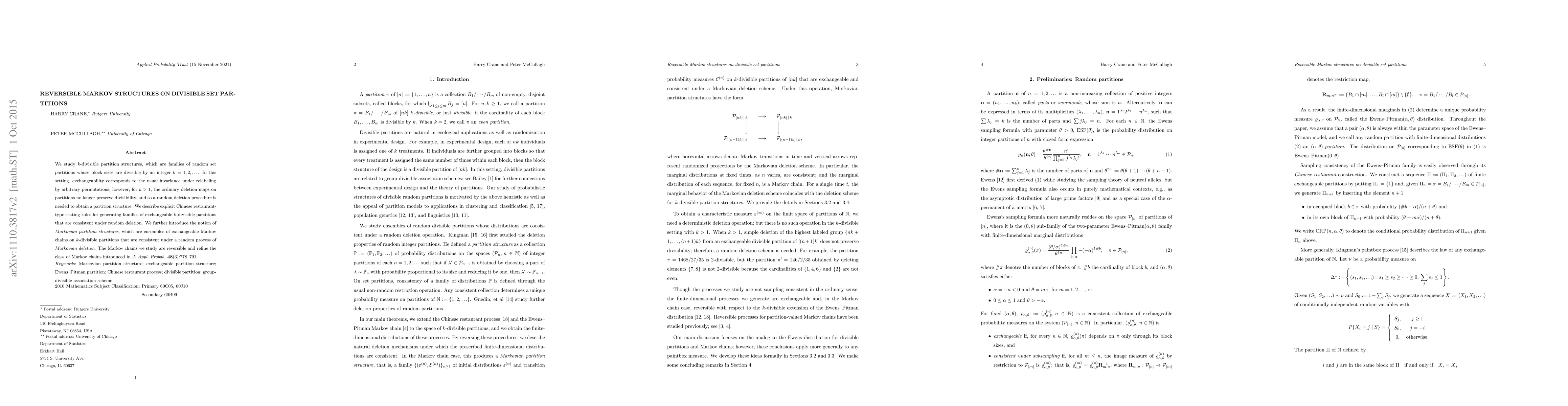 This paper explores $k$-divisible partition structures, introducing Chinese restaurant-type rules for generating exchangeable $k$-divisible partitions consistent under random deletion. It also defines Markovian partition structures, which are reversible Markov chains on $k$-divisible partitions, refining an existing class of Markov chains.