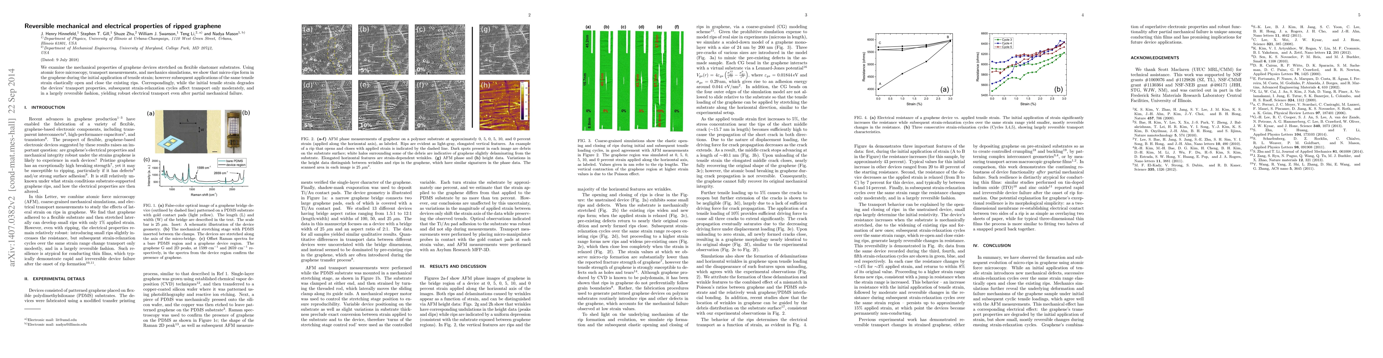 The study employs atomic force microscopy, transport measurements, and mechanics simulations to analyze graphene devices stretched on flexible elastomer substrates, revealing micro-rips forming in graphene under tensile strain and their reversible behavior in subsequent cycles.