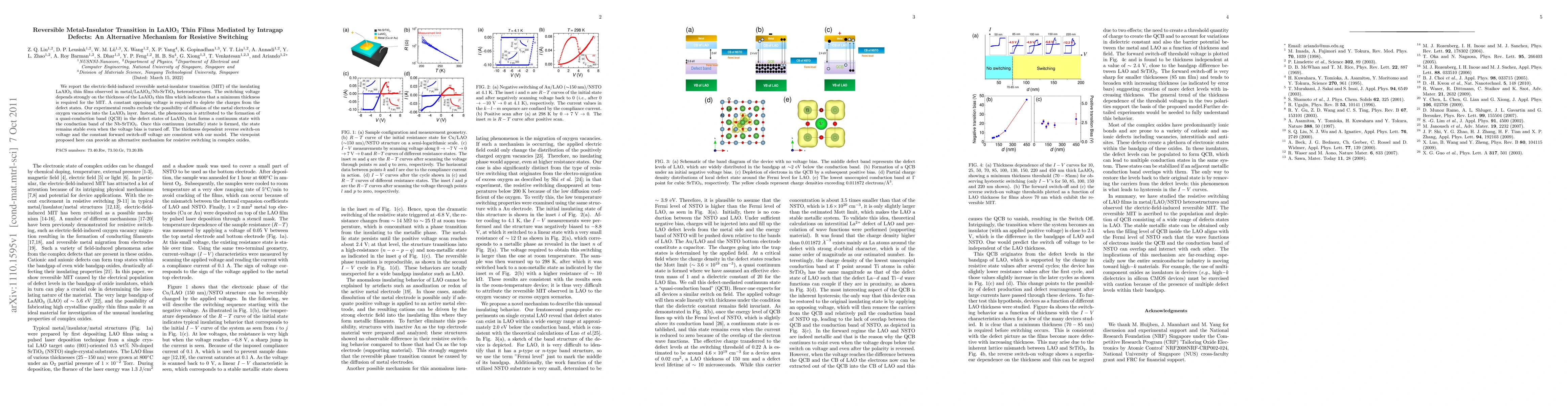 This paper investigates the reversible metal-insulator transition in LaAlO3 thin films, attributing it to the formation of a quasi-conduction band in intragap defect states rather than electrode diffusion or oxygen vacancies. The transition is stable even after voltage removal, offering a new resistive switching mechanism in complex oxides.