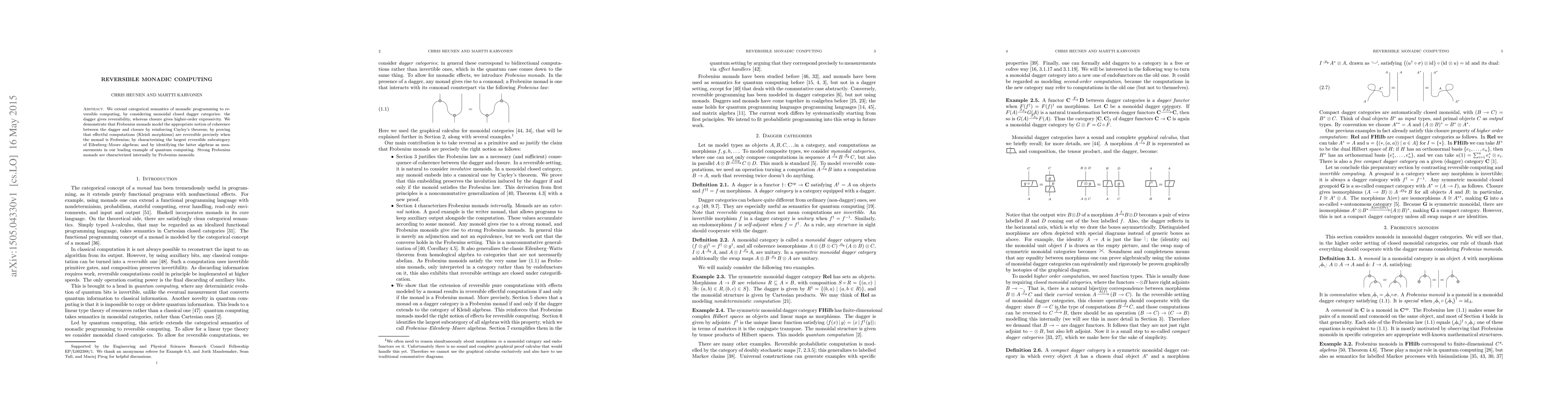 This paper extends categorical semantics of monadic programming to reversible computing using monoidal closed dagger categories, showing that Frobenius monads enable reversible effectful computations and characterize the largest reversible subcategory of Eilenberg-Moore algebras, which are identified as measurements in quantum computing. Strong Frobenius monads are internally characterized by Frobenius monoids.