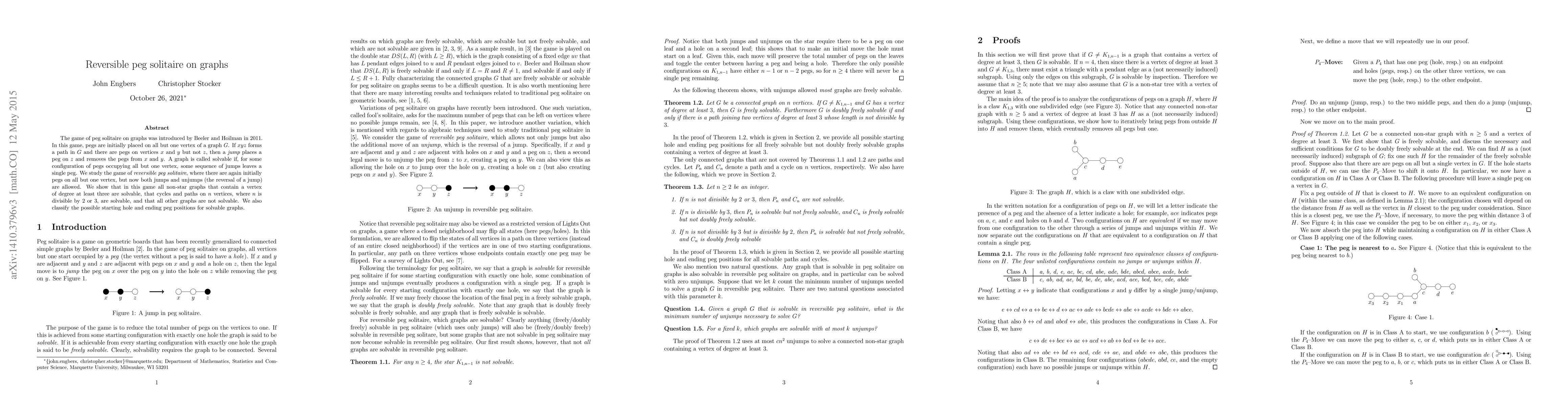 This paper studies the reversible version of peg solitaire on graphs, where both jumps and unjumps are allowed. It concludes that non-star graphs with at least one vertex of degree three, cycles, and paths divisible by 2 or 3 are solvable, while other graphs are not. The study also classifies starting and ending positions for solvable configurations.